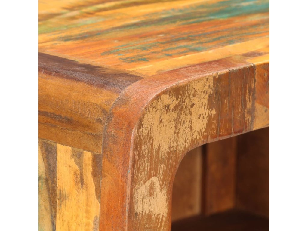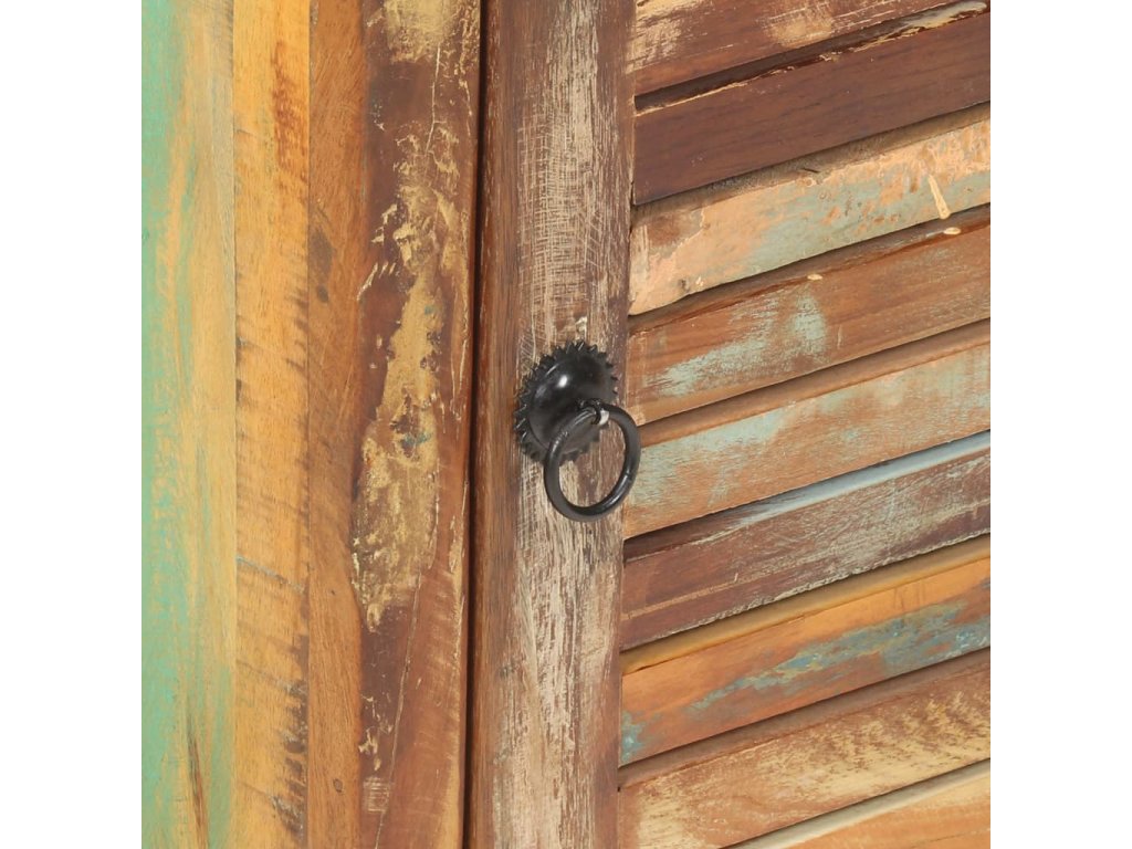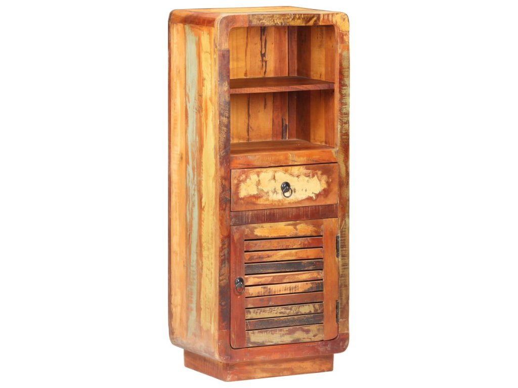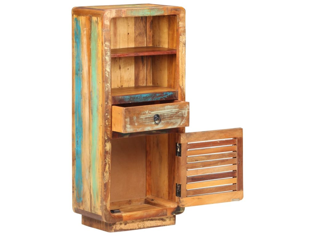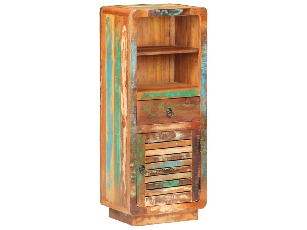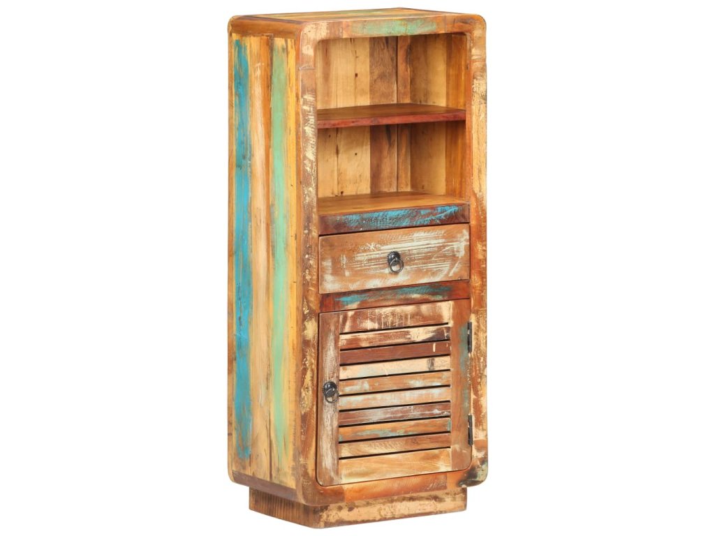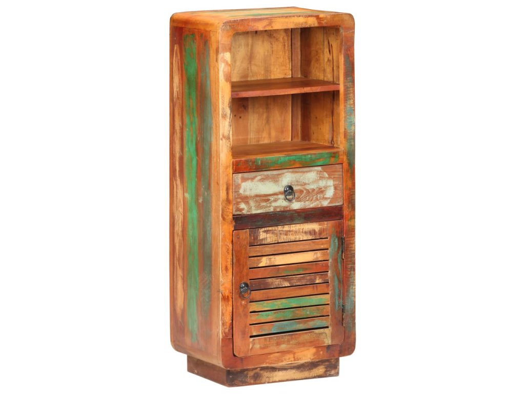 Dřevěná komoda je vyrobená z masivního recyklovaného dřeva s vícebarevnou povrchovou úpravou. Recyklované dřevo pochází z trámů, podlah a podpěrných nosníků starých budov určených k demolici. Sestává tedy z různých druhů dřeva, jako jsou teak, tvrdé dřevo, tropické dřevo, mangovník apod. Recyklované dřevo tak nabývá vlastností všech těchto rozličných typů dřevin. Navíc je již zestárlé, ošlehané a vyschlé, takže se nesmršťuje ani neohýbá. Odkládací skříňka nabízí spoustu úložného prostoru v přihrádce s dvířky, zásuvce a dvou poličkách.