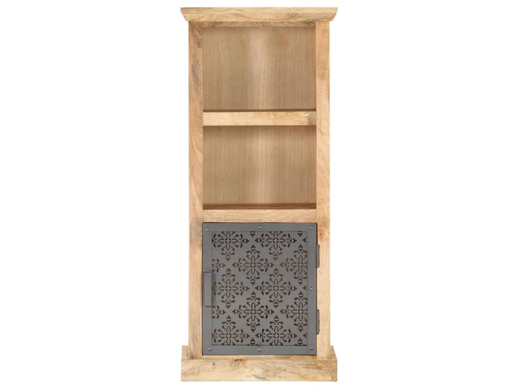 Tato vysoká skříňka z masivního mangovníkového dřeva byla zručně vyleštěná, natřená a nalakovaná a na první pohled zaujme svou nádhernou a rafinovanou povrchovou úpravou. Vyřezávaná ocelová dvířka ještě víc zdůrazňují její krásu. Ve dvou otevřených policích a v přihrádce s dvířky najdete dostatek úložného prostoru pro vaše knihy, časopisy, hrnkové rostliny, zarámované fotografie nebo další osobní potřeby.