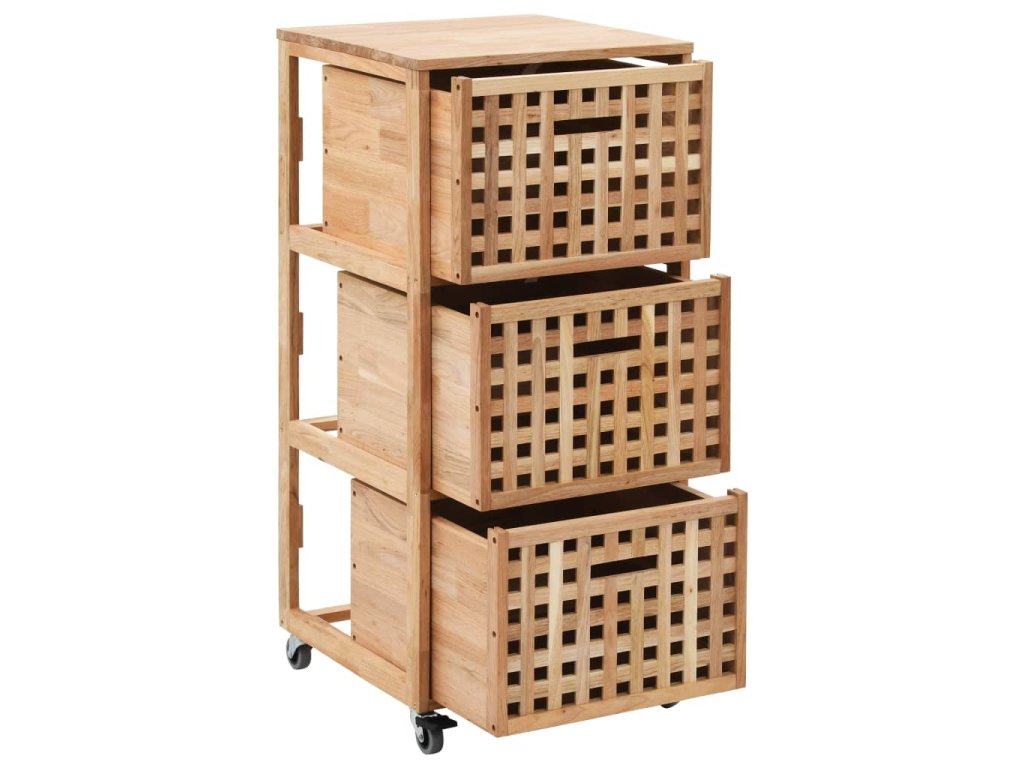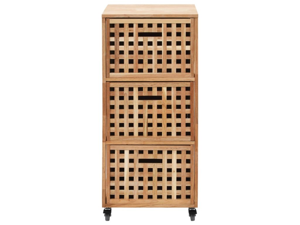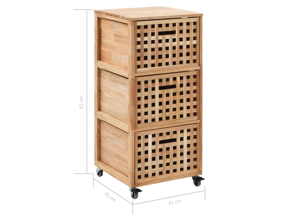 Koupelnová skříňka obsahuje tři koše, které vám poskytnou spoustu místa na ukládání věcí, jako jsou ručníky, špinavé prádlo, hygienické potřeby atd. Mřížkovaný design umožňuje dobré větrání věcí uvnitř koše. Skříňka je vyrobena z masivního ořechového dřeva a překližky, takže je velmi robustní a odolná. Čtyři kolečka usnadňují přesouvání skříňky z jednoho místa na druhé.