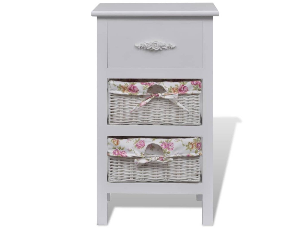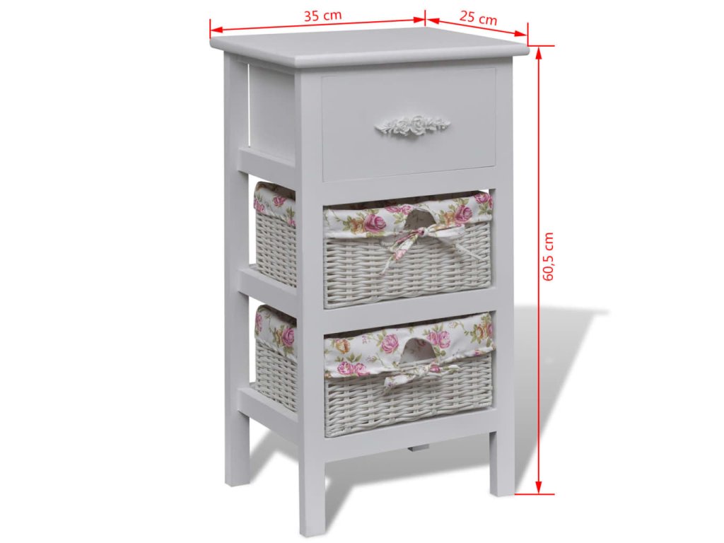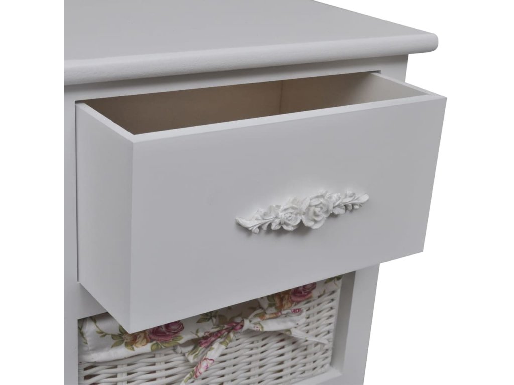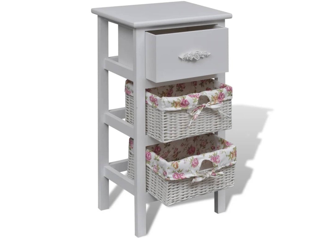 Tato dřevěná skříňka s jednou zásuvkou a dvěma košíky, vyrobená z vysoce kvalitního dřeva, má jednoduchý a stylový design. Bude nejen poskytovat úložný prostor na vaše věci, ale také vnese trochu romantiky do vašeho interiéru.