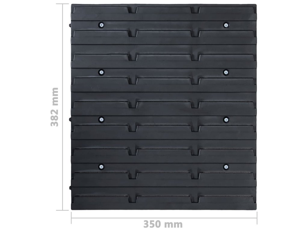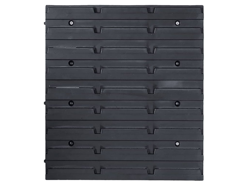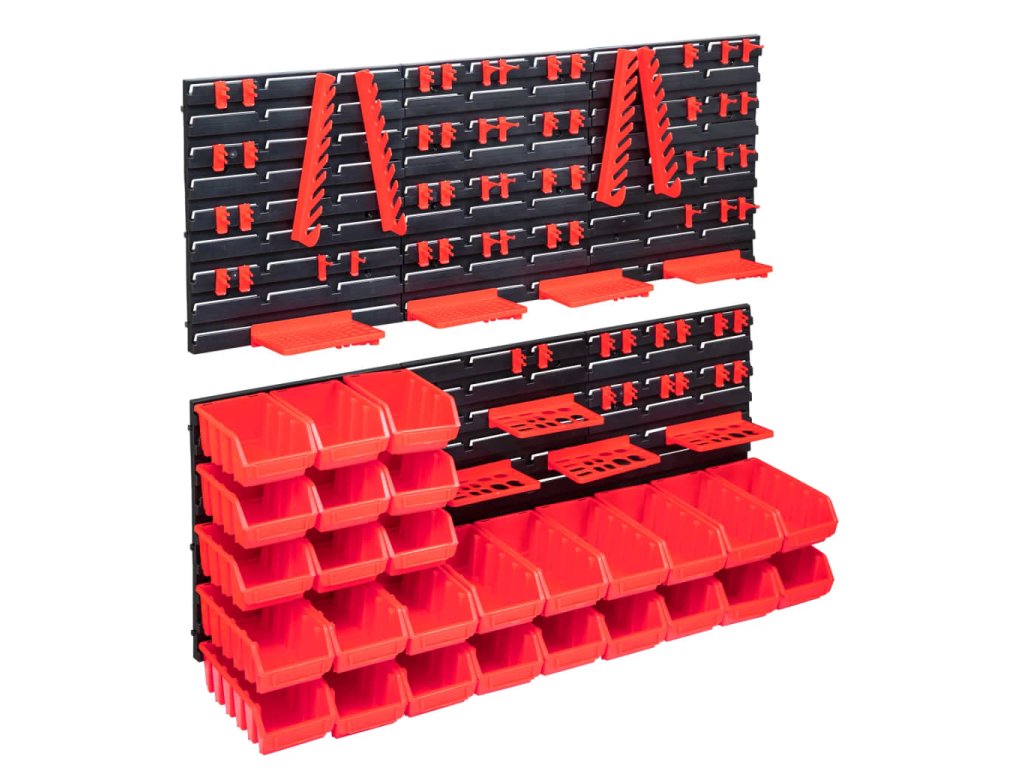 Tyto funkční panely se stohovatelnými boxy nabízí celou řadu možností pro ukládání malých součástek, jako jsou šrouby, hřebíky, matice, objímky, spojky apod. Do 6 pevných nástěnných panelů jsou připevněné držáky a upínače pro nejrůznější typy nářadí a 27 zásobníků, které si lze označit, abyste měli lepší přehled o jejich obsahu. Jednotlivé boxy můžete také samostatně vytahovat a naskládat je na sebe. Sadu panelů na nářadí je možné libovolně rozšiřovat a dá se snadno namontovat na stěnu garáže nebo kůlny. Soupravu skladovacích zásobníků si můžete přizpůsobit dle vlastních potřeb.