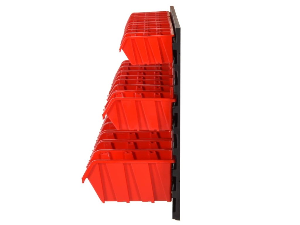 Tato praktická sada dílenských polic se skládá z nástěnných panelů a úložných boxů. Je to perfektní volba, jak si udržet na pracovišti pořádek a přitom mít malé součástky po ruce!