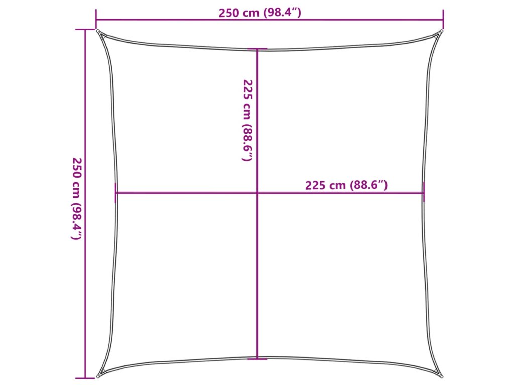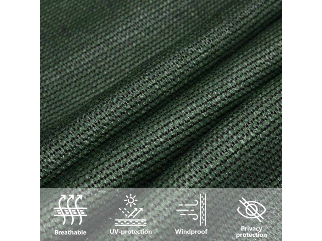 Sluneční plachta vyrobená ze 100% HDPE (vysokohustotní polyethylen) vás chrání před přímým slunečním zářením, umožňuje dostatečný průchod vzduchu a je propustná pro vodu. HDPE je speciálně upraven, takže je odolný proti plísním a UV záření. Slunečník se snadno sestavuje pomocí nerezových upevňovacích prvků na každém rohu a přiložených lanek.