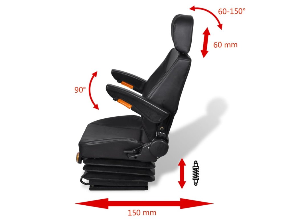 Tato traktorová sedačka s otevřeným tvarem vám poskytne zvýšené pohodlí. Je polstrovaná speciální pěnou pro příjemný komfort. Robustní odpružení tohoto traktorového sedadla zajišťuje tu nejhladší možnou jízdu na vašem traktoru. Traktorová sedačka je opatřena posuvnou dráhou pro snadnou a flexibilní instalaci. Odpružení je určeno pro zátěž v rozmezí 50–130 kg. Množství montážních otvorů na základové desce je určeno pro mimořádnou pevnost. Černé čalounění opěradla traktorové sedačky je velmi odolné a voděodolné. 150mm podélné nastavení umožňuje větší praktičnost a pohodlí. Opěrka hlavy a skládací područky jsou určeny k tomu, abyste se mohli více uvolnit.