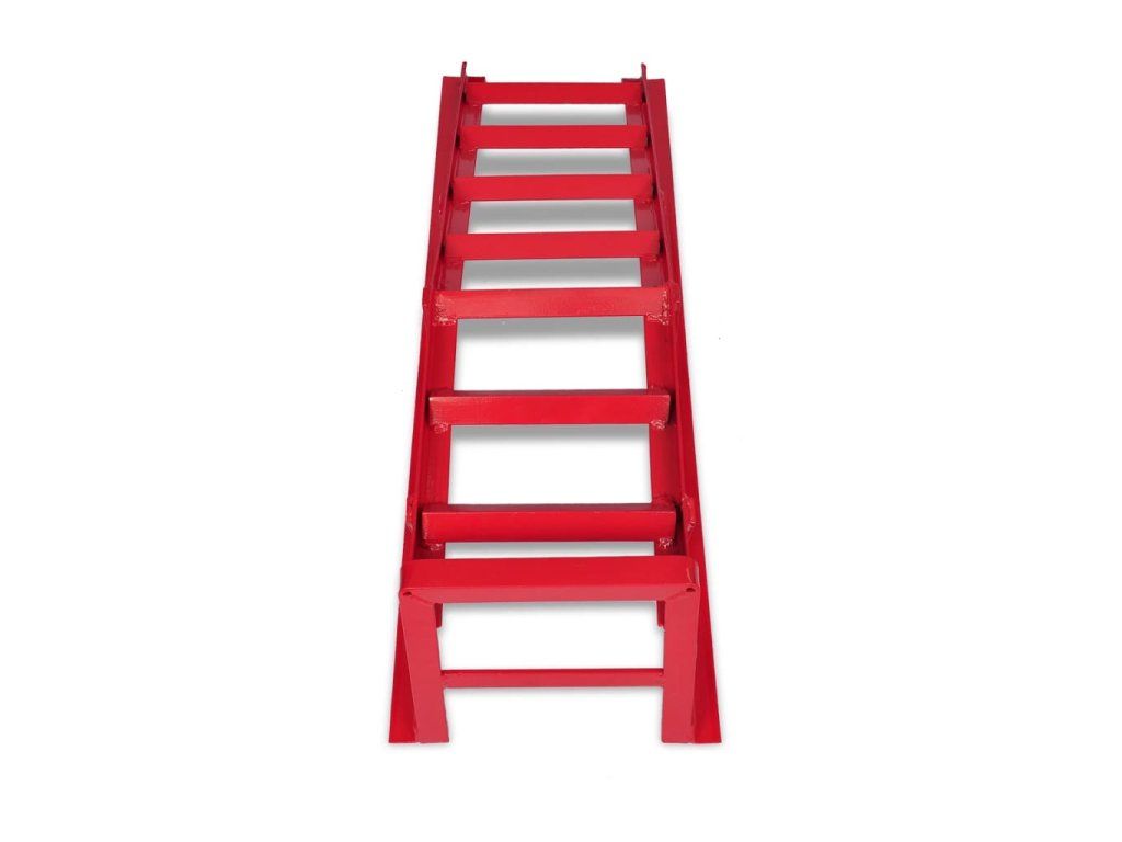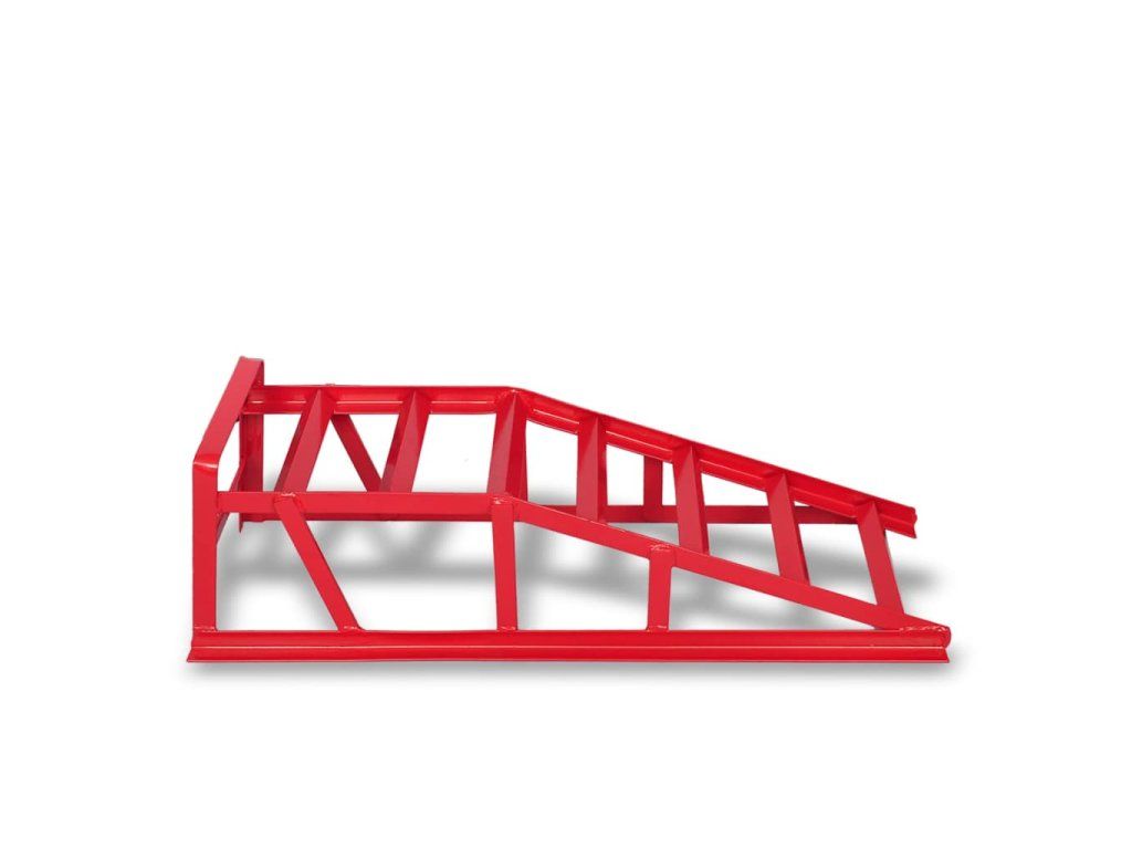 Tato dvojice ocelových automobilových ramp je vhodná pro automatické vystavení nebo údržbu. Jsou vyrobeny z 3mm ocelového plechu s červenou korozi odolnou stříkanou úpravou. Každá auto rampa má kapacitu 1000 kg, vhodná pro vozidla s max. šířkou pneumatik 235mm (berte do ohledu, že šířka pneumatiky může přesáhnout šířku rampy, ale bude viset mimo povrchu rampy). Zastávka je nastavena na přední části rampy pro bezpečnost, a ocelové příčníky v intervalech zabrání pneumatikám proti sklouznutí z povrchu.