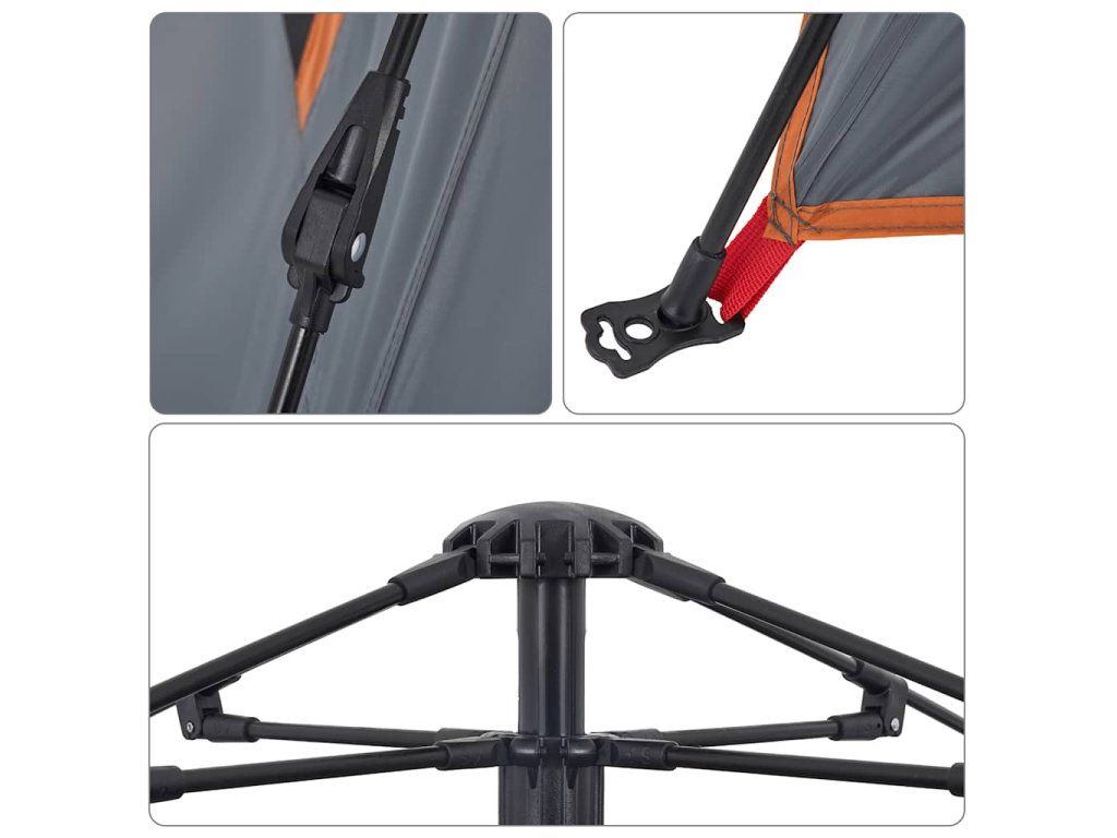 - Rychloupínací systém: Postavte stan snadno a bez námahy pomocí rychloupínacího systému! Stan položte na zem, roztáhněte předem sestavené tyče, dokud nezapadnou na své místo, a vše je hotovo!