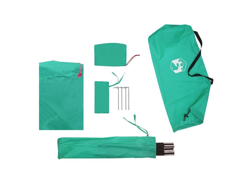 - Pytlíky s pískem a kolíky pro větší stabilitu: Plážový stan má v každém rohu pytlík s pískem k zajištění stability. K dispozici jsou také další kolíky, které stan upevní a zabrání jeho odfouknutí.
