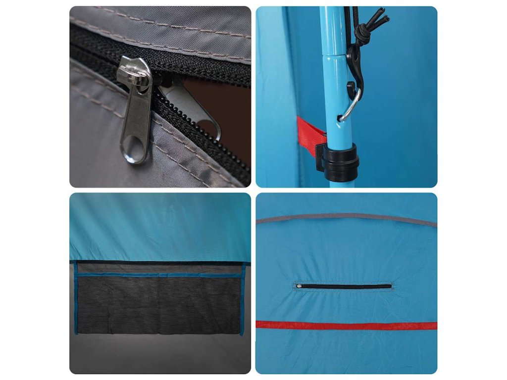 - Snadný přístup: Vchod na zip umožňuje snadný přístup. Podporuje také proudění vzduchu a zajišťuje dostatek přirozeného světla. Převlékací stan má šňůru na zavěšení oblečení a ručníků a také úložnou kapsu na drobnosti, jako jsou klíče, peněženky a telefony.