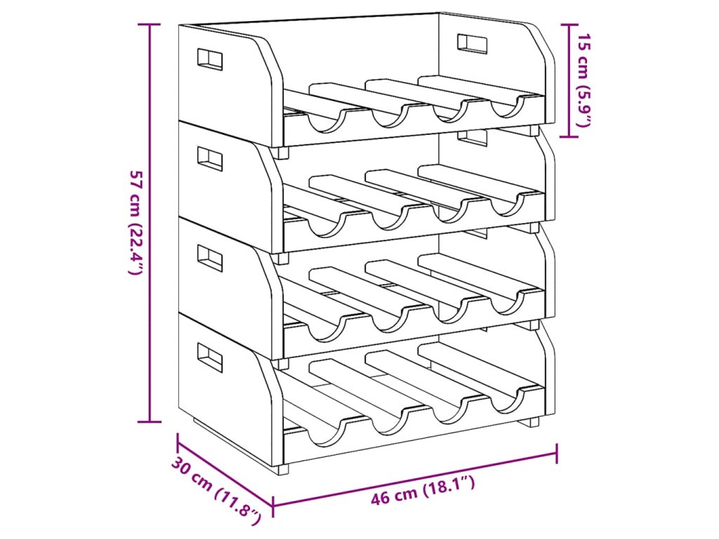 Sada stojanu na víno má jednoduchý, nadčasový design. Disponuje zabudovanými úchyty, díky kterým se jednotlivé stojany snadno přenášejí. Stojany se dají použít samostatně, nebo je můžete naskládat na sebe tak, abyste získali regál o více patrech. Sada byla vyrobena s největší možnou péčí.