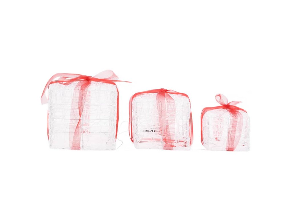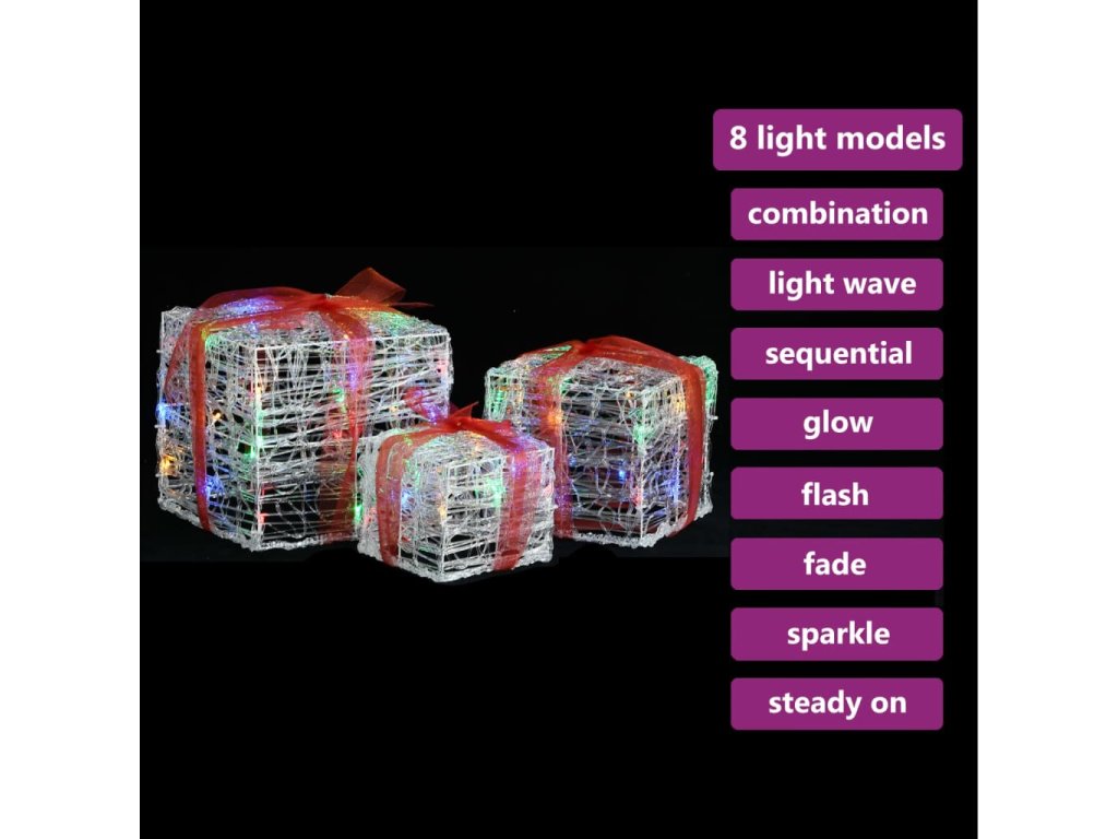 Tyto svítící dárky jsou vyrobeny z odolného a lesklého akrylu. Vánoční dárky jsou vybavené 48 energeticky úspornými LED diodami s dlouhou životností. Světla je možné rozsvítit v 8 různých světelných režimech: kombinace všech, pomalá záře, blikání/záblesky, svícení ve vlnách, tekoucí efekt, sekvenční svícení, stálé svícení a pomalé blednutí. Jakmile se rozsvítí vytvoří kouzelnou sváteční atmosféru. Jelikož jsou stohovatelné, snadno se skladují. Dekorativní mašle je odnímatelná. Pouzdro na baterie je navíc voděvzdorné, takže tyto vánoční dárky lze používat i venku.