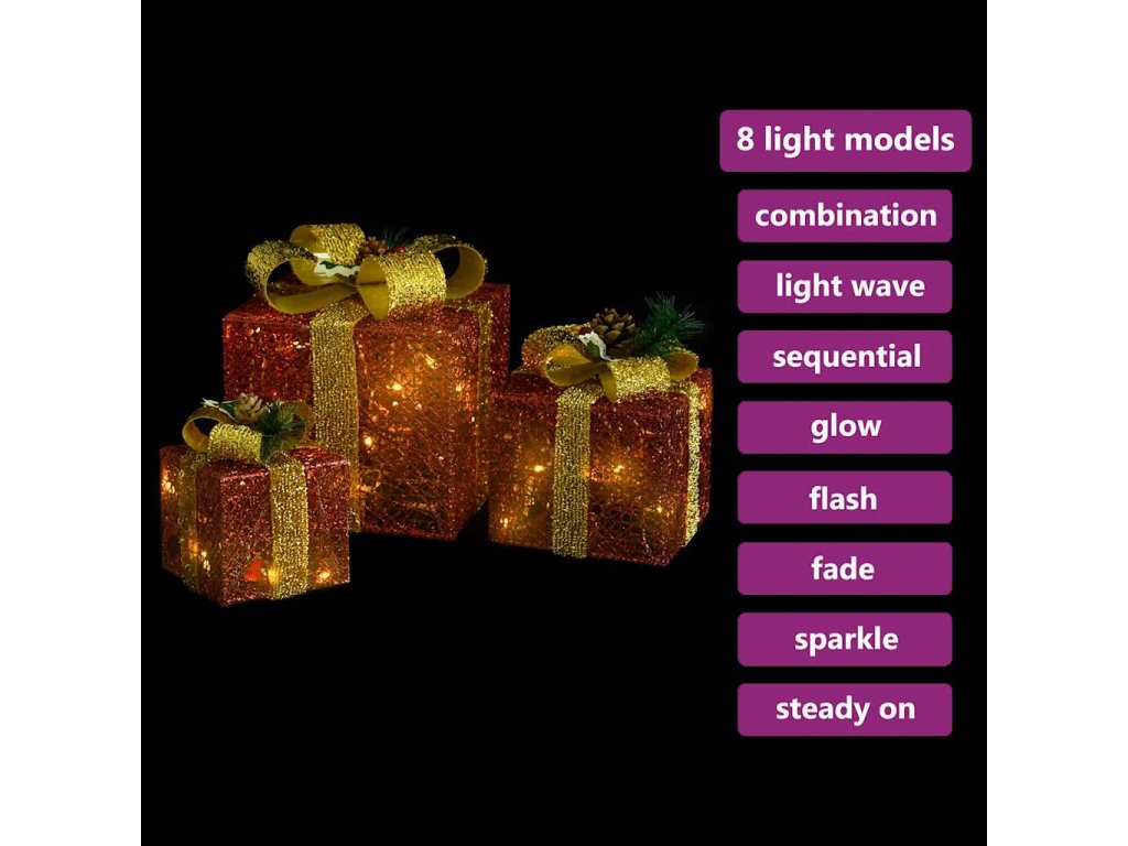 Tyto svítící dárky jsou vyrobené z pevné lesklé tkaniny, jsou tedy mimořádně odolné. Vánoční dárek je vybaven 60 energeticky úspornými LED diodami s dlouhou životností. Diody mají 8 různých světelných režimů: kombinace všech, pomalá záře, blikání/mihotání, svícení ve vlnách, efekt tekoucí vody, sekvenční svícení, stálé svícení a pomalé blednutí. Světla se krásně rozzáří a vytvoří kouzelnou sváteční atmosféru. Stohovatelný design přispívá ke snadnému a praktickému skladování. Dekorativní mašle je odnímatelná.