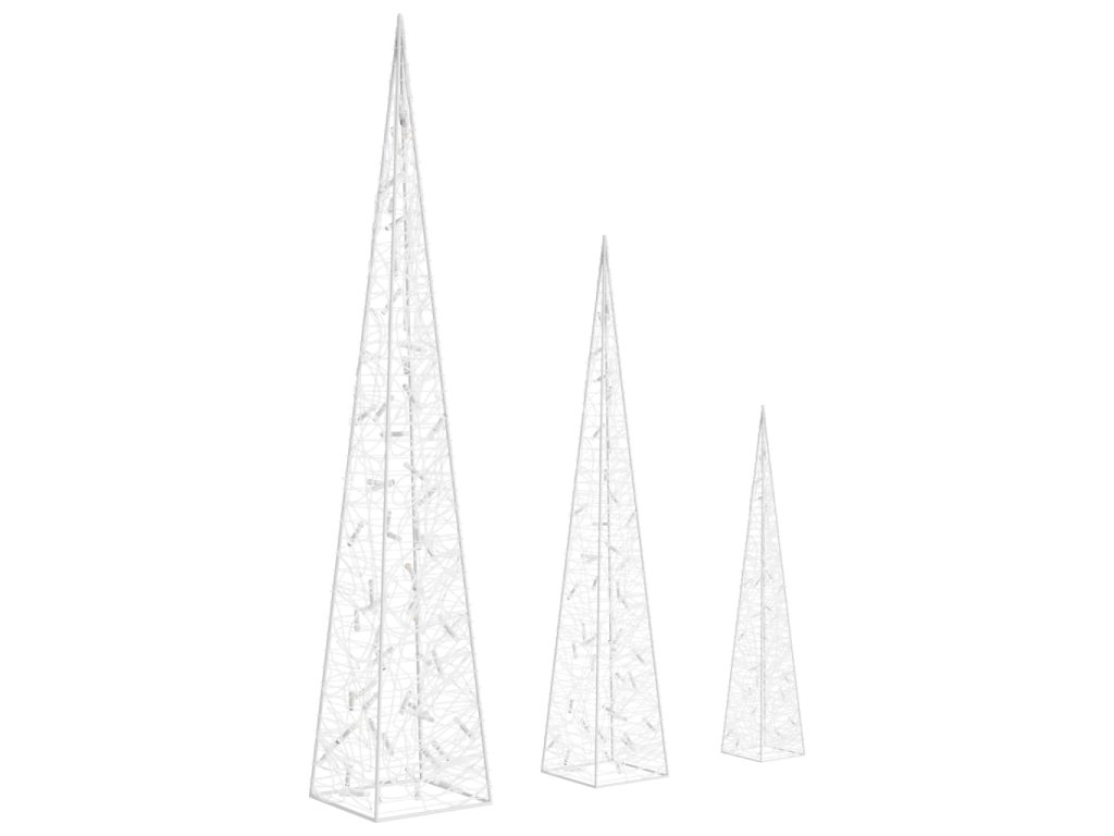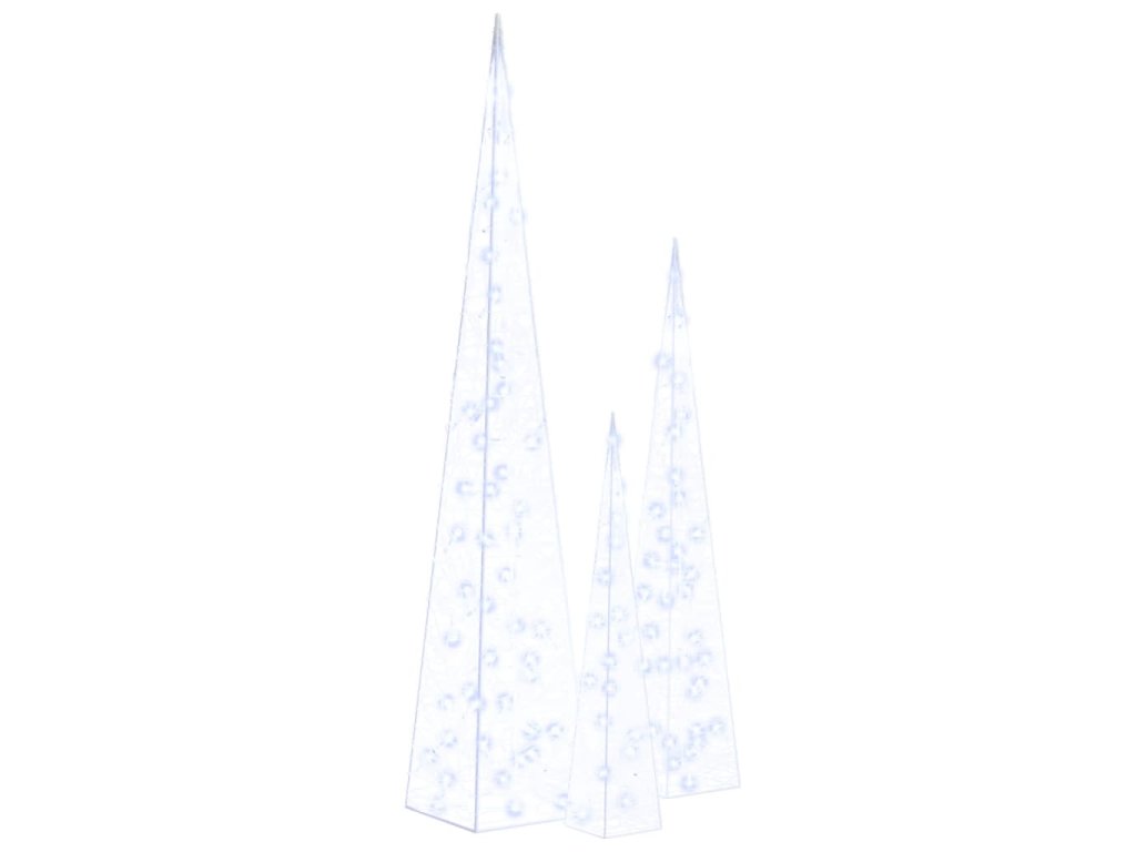 Sada obsahuje 3 světelné kužely s různou výškou. Tělo dekorativního světelného kužele je vyrobené z akrylu s luxusním, ledově lesklým vzhledem, který rozzáří celé své okolí. Je vybavené energeticky úspornými LED diodami a zajišťuje jasné a výkonné osvětlení. Má 8 různých světelných efektů: kombinovaný režim, svícení ve vlnách, sekvenční režim, pomalá záře, blikání, pomalé blednutí, mihotání a nepřetržité svícení. Tato sada krásných vánočních světelných kuželů a přiložené pouzdro na baterie jsou vodotěsné, takže výrobek je vhodný pro vnitřní i venkovní použití.