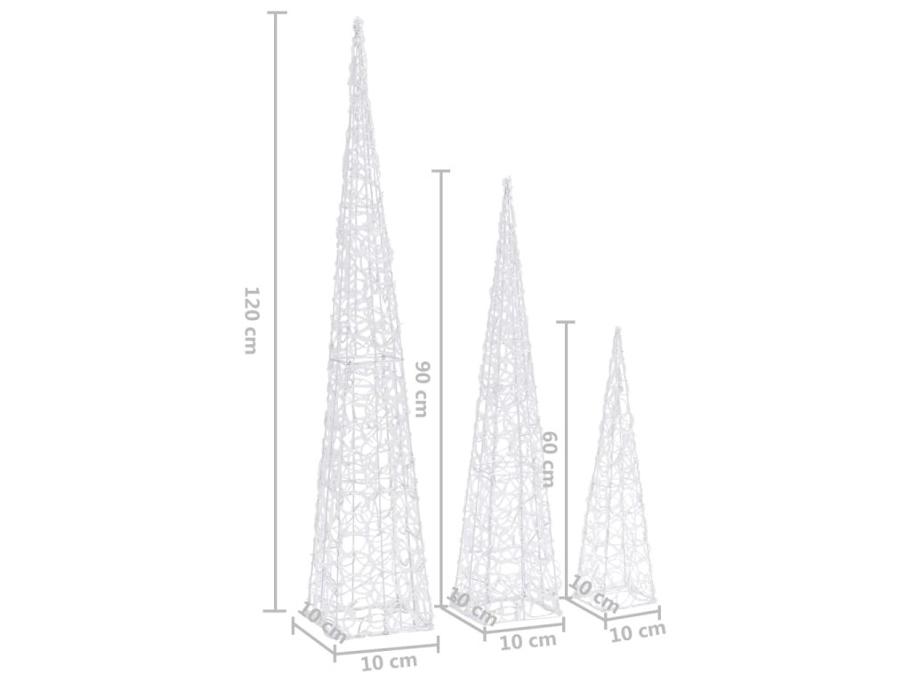 Sada obsahuje 3 světelné kužely s různou výškou. Tělo dekorativního světelného kužele je vyrobené z akrylu s luxusním, ledově lesklým vzhledem, který rozzáří celé své okolí. Je vybavené energeticky úspornými LED diodami a zajišťuje jasné a výkonné osvětlení. Má 8 různých světelných efektů: kombinovaný režim, svícení ve vlnách, sekvenční režim, pomalá záře, blikání, pomalé blednutí, mihotání a nepřetržité svícení. Tato sada krásných vánočních světelných kuželů a přiložené pouzdro na baterie jsou vodotěsné, takže výrobek je vhodný pro vnitřní i venkovní použití.