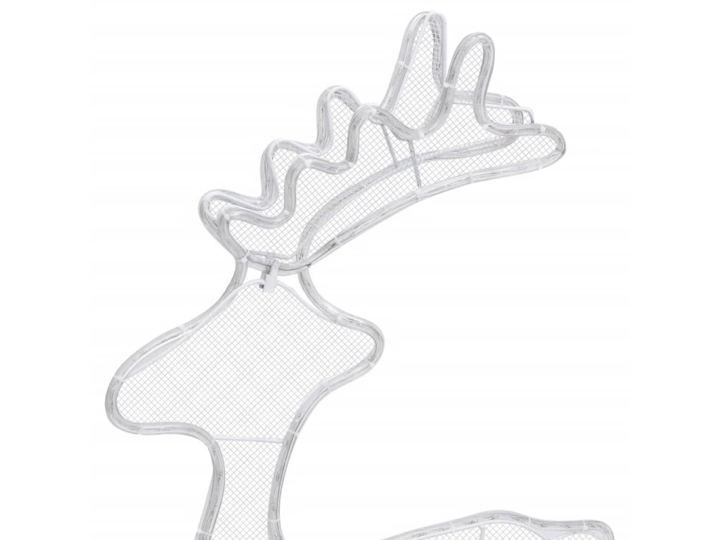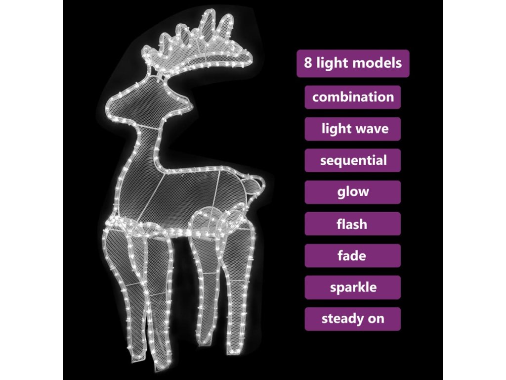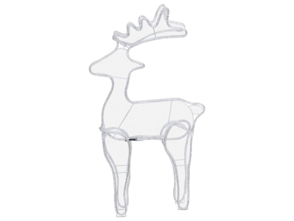 Tato sobí dekorace je vyrobená z PVC a ocelového rámu, který po celou dobu svátků bude vzdorovat povětrnostním vlivům. Dekorace je osvícená 360 LED světly, která jsou energeticky úsporná, s dlouhou výdrží a životností. Tento osvětlený sob má 1,5 m dlouhý kabel s IP44 adaptérem. Lze ho používat v interiéru i exteriéru.