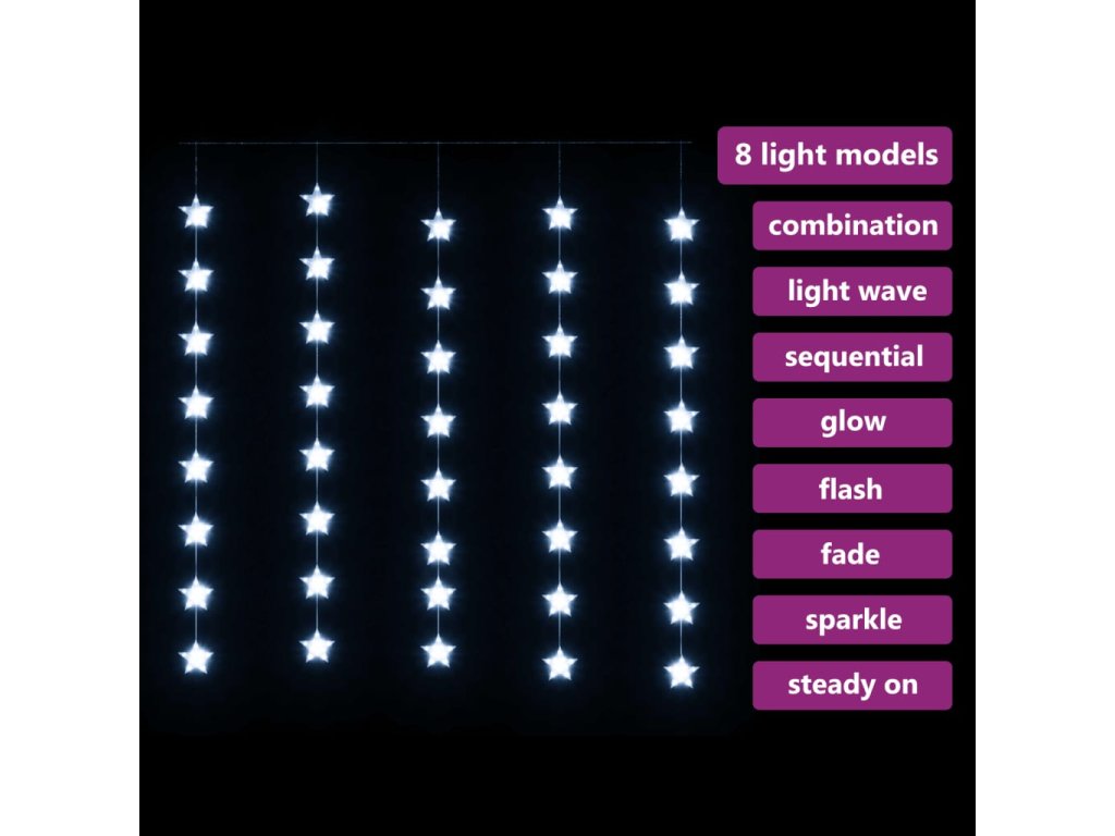 Světelný závěs je vybavený 200 energeticky úspornými LED diodami, které vytvářejí kouzelné osvětlení. Má 8 různých světelných efektů: kombinovaný režim, svícení ve vlnách, sekvenční režim, pomalá záře, blikání, pomalé blednutí, mihotání a nepřetržité svícení. Je to skvělé dekorativní osvětlení vnitřních i venkovních prostor.