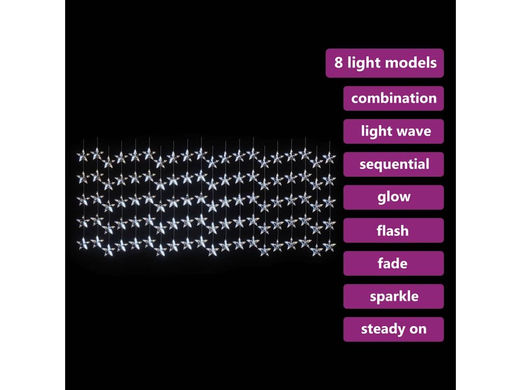 Světelný závěs je vybavený 500 energeticky úspornými LED diodami, které vytvářejí kouzelné osvětlení. Má 8 různých světelných efektů: kombinovaný režim, svícení ve vlnách, sekvenční režim, pomalá záře, blikání, pomalé blednutí, mihotání a nepřetržité svícení. Je to skvělé dekorativní osvětlení vnitřních i venkovních prostor.