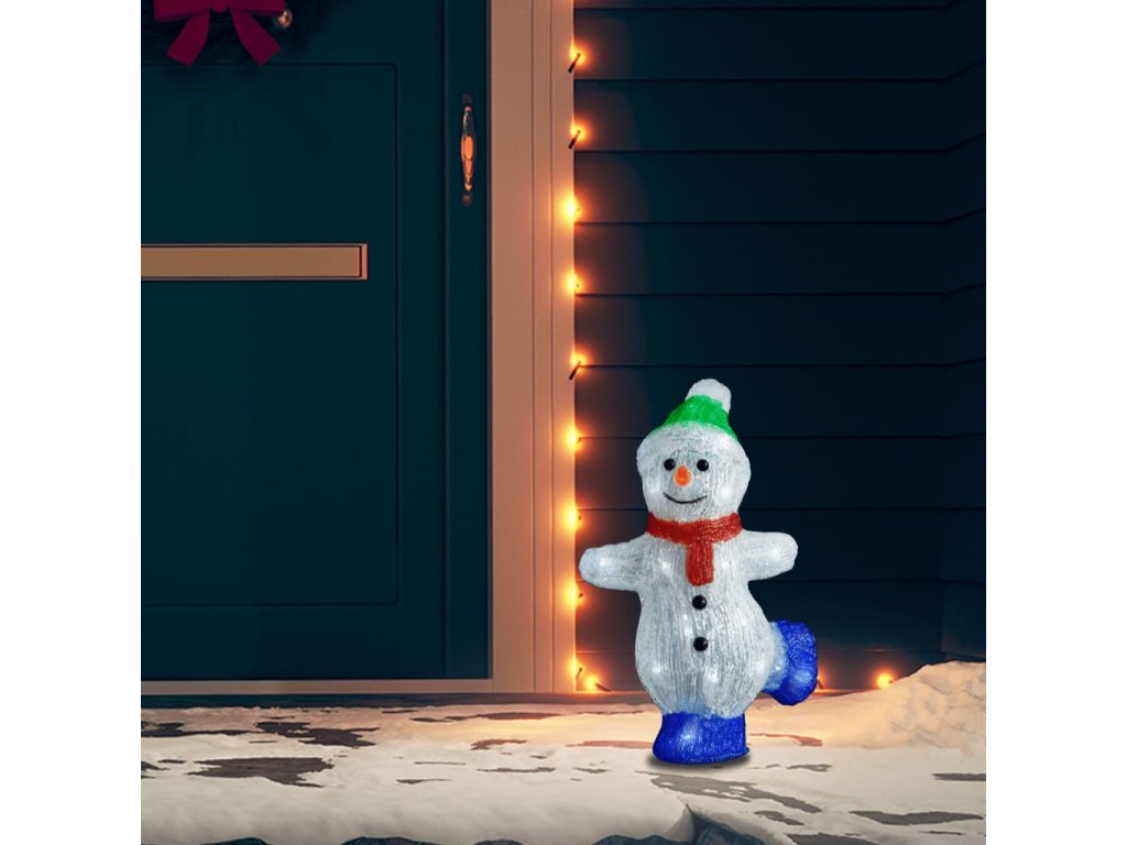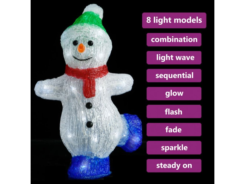 Sněhulák je vyrobený z pevného akrylového materiálu. Tato vánoční dekorace má 30 LED světel, která jsou energeticky úsporná a mají dlouhou životnost. Jsou navržená s 8 různými světelnými efekty: kombinace všech efektů, pomalé svícení, mihotání/blikání, svícení ve vlnách, efekt tekoucí vody, sekvenční svícení, stálé světlo a pomalé slábnutí světla. Ať už zvolíte jakýkoli efekt, dekorace se krásně rozsvítí a vytvoří kouzelnou sváteční atmosféru. Pouzdro na baterie je voděodolné, takže můžete sněhuláka umístit venku.