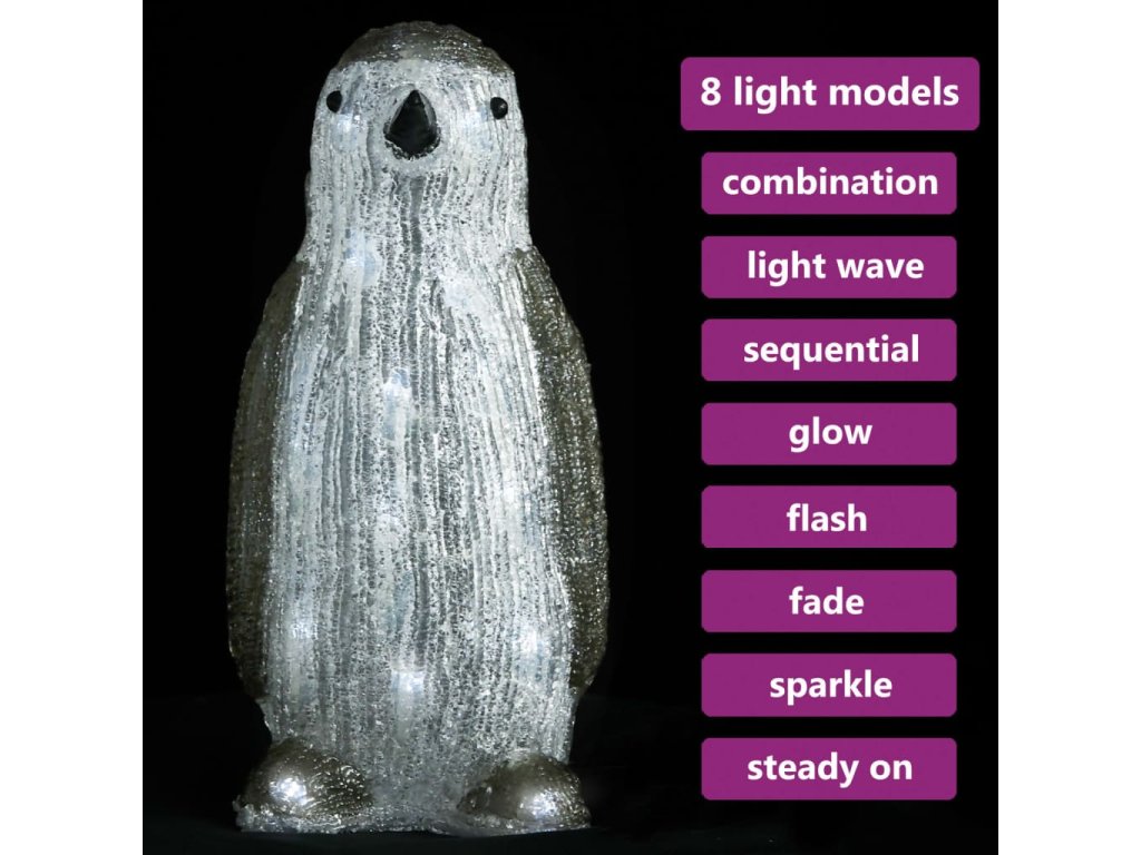 Tučňák je vyrobený z pevného akrylového materiálu. Tato vánoční dekorace má 20 LED světel, která jsou energeticky úsporná a mají dlouhou životnost. Jsou navržená s 8 různými světelnými režimy: kombinace všech efektů, pomalé svícení, mihotání/blikání, svícení ve vlnách, efekt tekoucí vody, sekvenční svícení, stálé světlo a pomalé blednutí. Ať už zvolíte jakýkoli efekt, dekorace se krásně rozsvítí a vytvoří kouzelnou sváteční atmosféru. Pouzdro na baterie je voděodolné, takže můžete tučňáka umístit i ven.