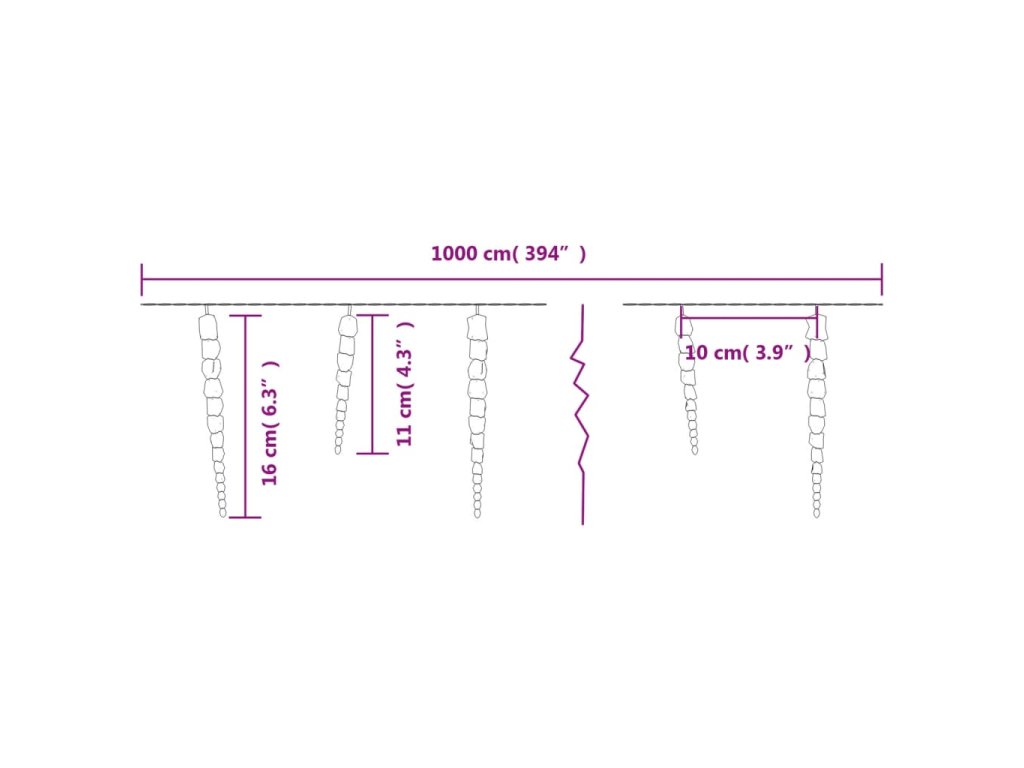 - 100 LED světel ve tvaru rampouchu: Tento světelný řetěz obsahuje celkem 100 energeticky úsporných LED světel ve tvaru rampouchu, které vytvoří magickou světelnou show!