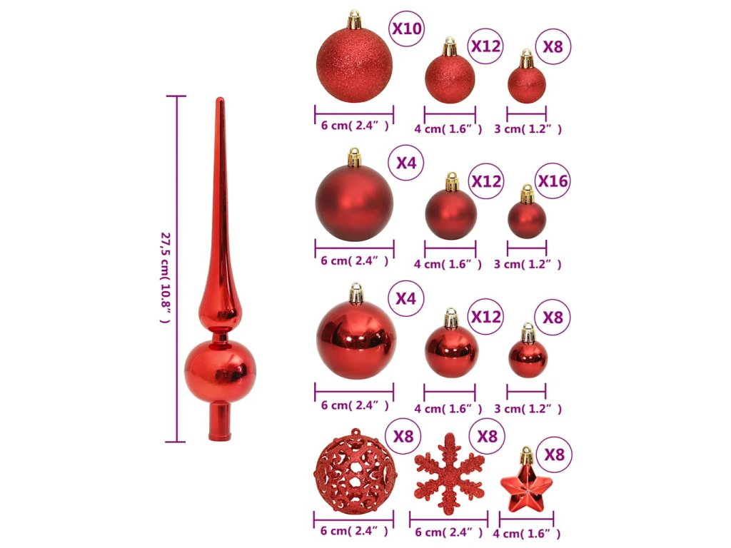 - Různé styly a velikosti: Tato kolekce vánočních koulí obsahuje koule o třech průměrech (3 cm, 4 cm a 6 cm), sněhové vločky, hvězdy a špici. Tyto koule mají čtyři styly (matné, třpytivé, lesklé a s ažurovým vzorem).