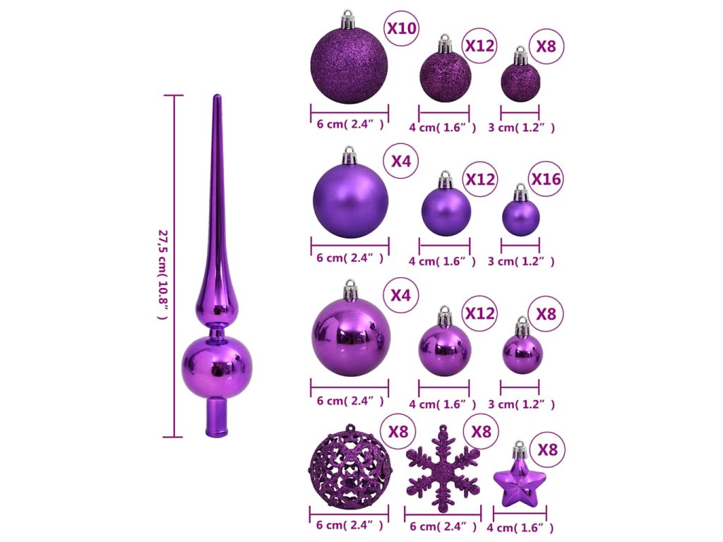 - Různé styly a velikosti: Tato kolekce vánočních koulí obsahuje koule o třech průměrech (3 cm, 4 cm a 6 cm), sněhové vločky, hvězdy a špici. Tyto koule mají čtyři styly (matné, třpytivé, lesklé a s ažurovým vzorem).