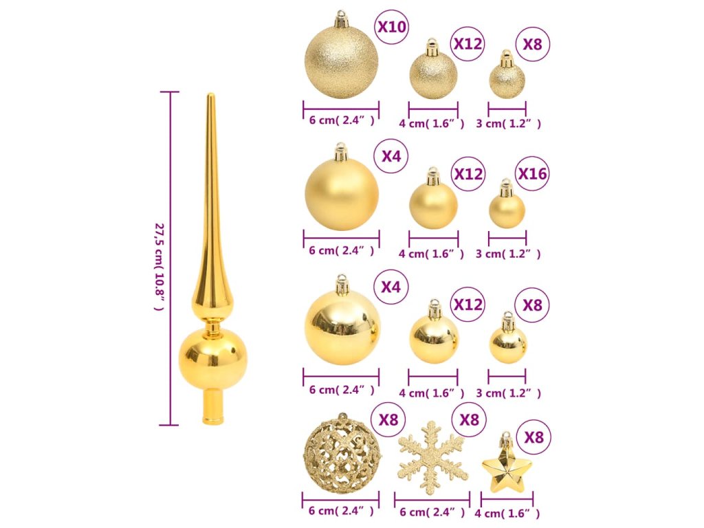 - Různé styly a velikosti: Tato kolekce vánočních koulí obsahuje koule o třech průměrech (3 cm, 4 cm a 6 cm), sněhové vločky, hvězdy a špici. Tyto koule mají čtyři styly (matné, třpytivé, lesklé a s ažurovým vzorem).