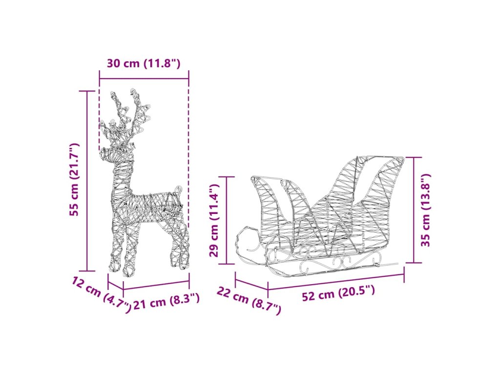 Toto vánoční dekorativní sobí saně je perfektním doplňkem každé sváteční výzdoby. Zosobňuje moderní eleganci s čistými liniemi a minimalistickým stylem. Vyrobené z kvalitních materiálů, vypadá skvěle a skvěle se hodí do obýváku nebo na terasu. Teplé bílé tóny dodávají kouzelný nádech do vaší sezónní dekorace. Jeho velká velikost ho dělá výjimečným prvkem, který se ale stále vejde do různých prostor uvnitř nebo venku, spojující tradiční symboliku sobů s moderním stylem.