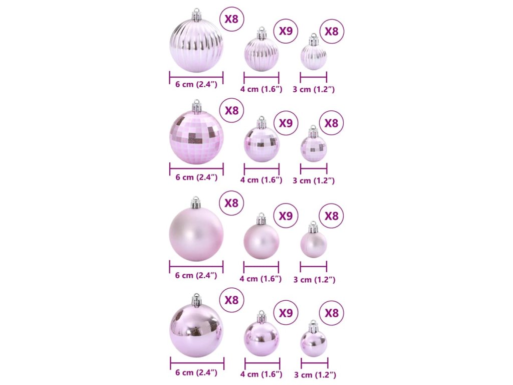 - Více velikostí: Sada nabízí flexibilitu: ozdoby jsou k dispozici ve třech průměrech a čtyřech typech, což umožňuje vytvořit různé kombinace dekorací, které odpovídají různým preferencím a velikostem stromků.