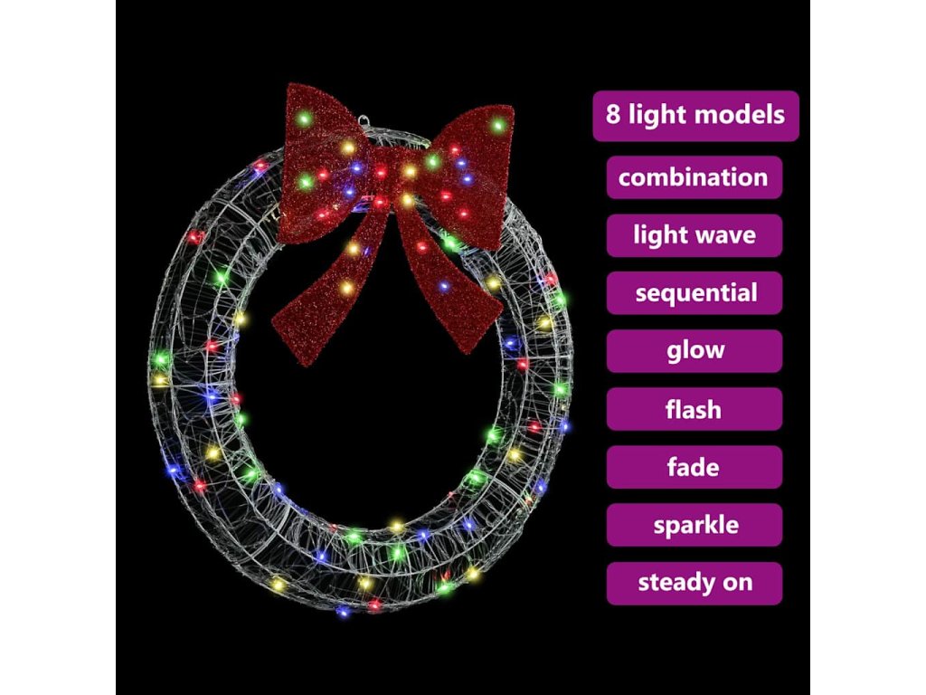 Elegantní akrylový materiál Vysoce kvalitní akryl dělá tento věnec super elegantním, jeho lesklý povrch krásně odráží světlo a dodává vaší výzdobě nádech sofistikovanosti. Lehkost usnadňuje manipulaci a zajišťuje dlouhou životnost. Jemné osvětlovací LED světla Díky flexibilním LED páskům tento věnec přináší teplé, příjemné světlo do jakéhokoli prostoru. Energeticky úsporné LED nabízejí nastavitelnou jasnost a příjemnou atmosféru, která umocní vánoční náladu a váš domov udělá vítaným místem. Pohodlí napájení přes USB Navržen tak, aby vyhovoval moderním domovům, USB napájení umožňuje bezproblémové připojení k jakémukoli standardnímu USB portu. To poskytuje možnost umístit ho na dveře, stěny nebo stoly bez použití klasických zásuvek. Stylový moderní design S čistými, prostými liniemi a minimálním zdobením se tento věnec skvěle hodí k ostatní výzdobě. Ideální pro fanoušky minimalistického stylu, přináší moderní nádech do vaší sezónní výzdoby. Snadné sestavení Dodáván jako jeden kus, sestavení je jednoduché, stačí připevnit mašli a umístit LED pásky. Díky uživatelsky přívětivému procesu strávíte víc času užíváním volna na Vánoce.- Barva: Vícebarevný