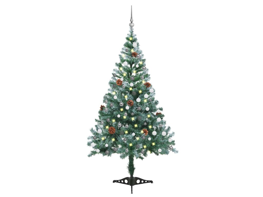 Námrazou pokrytý vánoční stromek LED sada koulí a šišky 150 cm 3077699