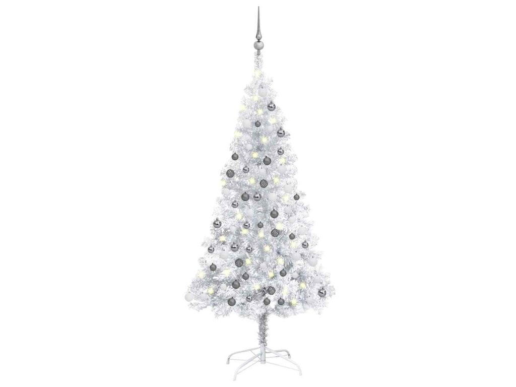Umělý vánoční stromek s LED a sadou koulí stříbrný 150 cm PET 3077695