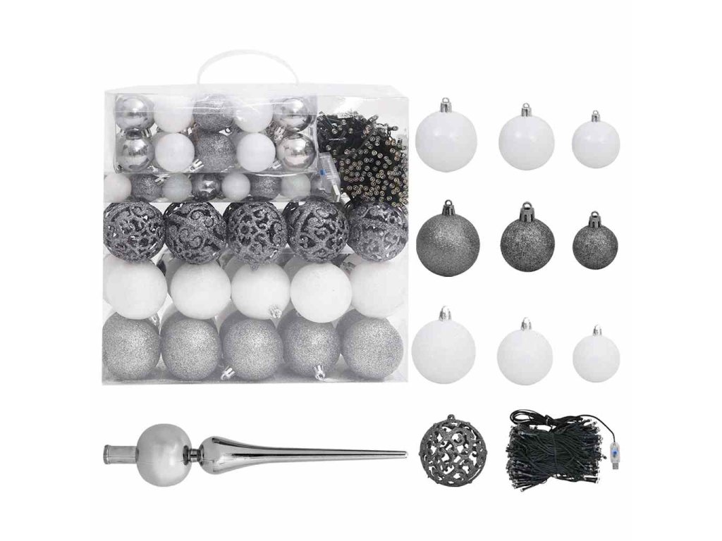 - Barva koulí: lesklá bílá, třpytivá bílá, lesklá šedá a třpytivá šedá