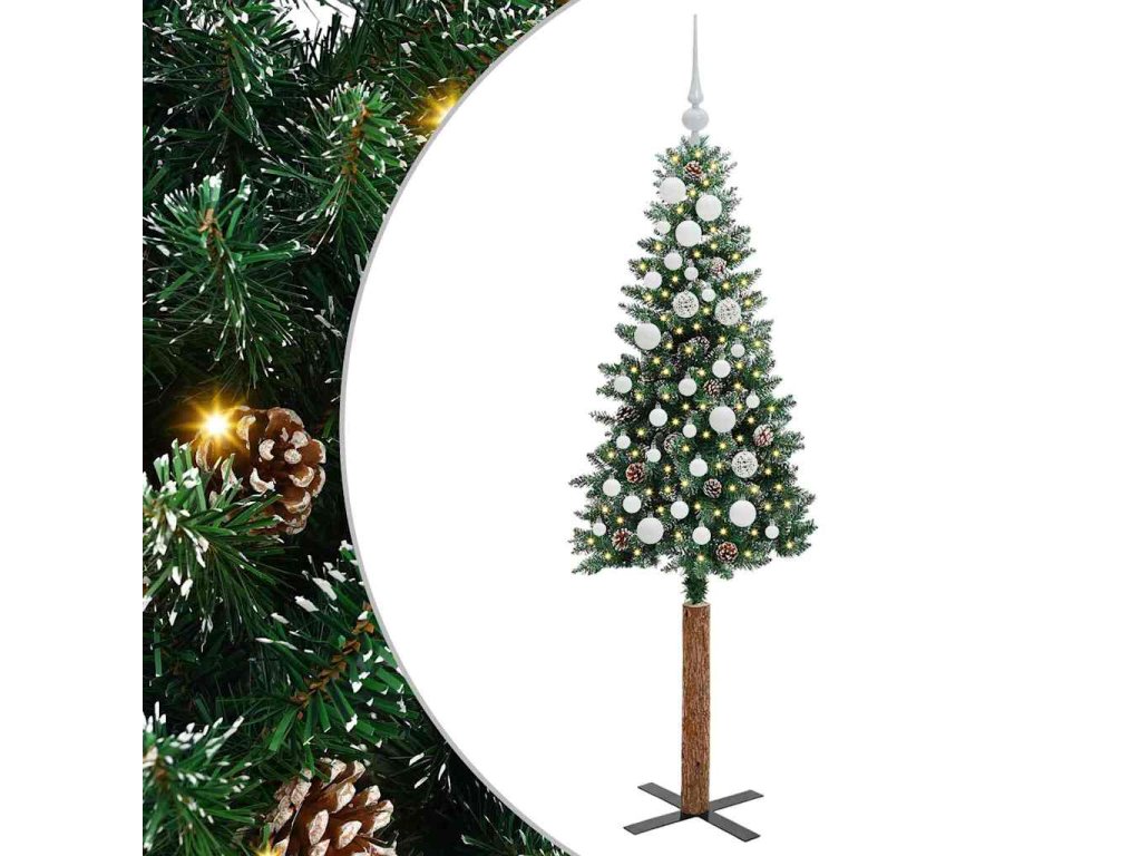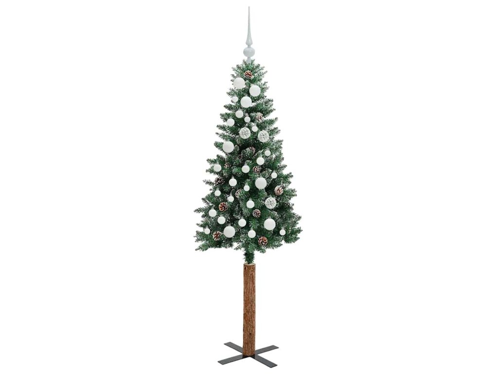 - Dekorační s borovicovými šiškami a ozdobnými koulemi, realistické větvičky s mraženým sněhem, skutečný dřevěný kmen
