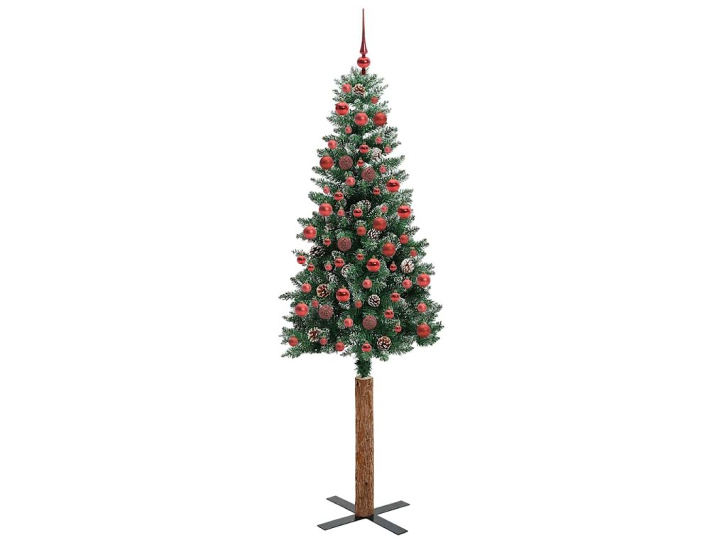 - Dekorační s borovicovými šiškami a ozdobnými koulemi, realistické větvičky s mraženým sněhem, skutečný dřevěný kmen