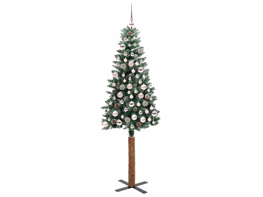- Dekorační s borovicovými šiškami a ozdobnými koulemi, realistické větvičky s mraženým sněhem, skutečný dřevěný kmen