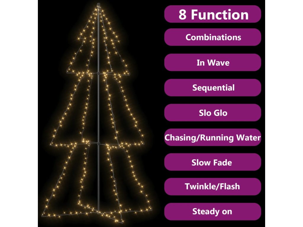 Světýlka obsahují 300 vysoce výkonných LED diod, které jsou velmi energeticky úsporné a vydávají jasné světlo. Diody mají 8 různých světelných režimů: kombinace všech, pomalá záře, blikání/mihotání, svícení ve vlnách, efekt tekoucí vody, sekvenční svícení, stálé svícení a pomalé blednutí. Světla se krásně rozzáří a vytvoří kouzelnou sváteční atmosféru. Bude to opravdová potěcha por oči, obzvláště večer, a také slouží jako útulný zdroj světla v místnosti. Volně stojící kužel lze snadno a bezpečně připevnit k zemi za pomoci přiloženého montážního materiálu.