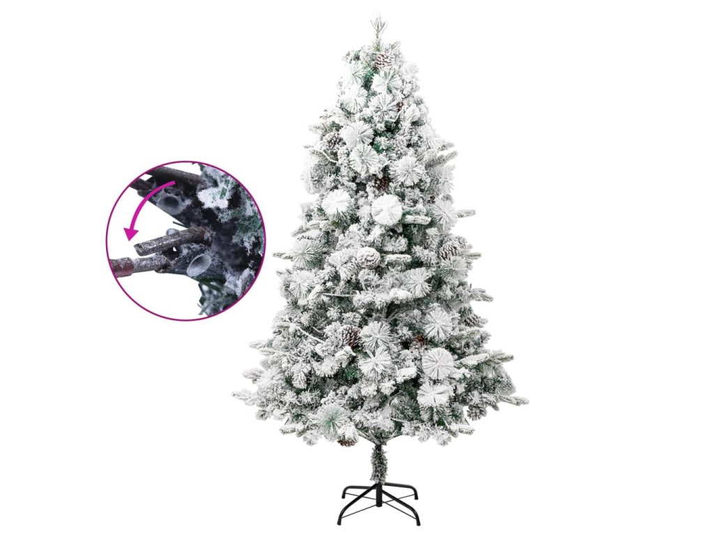 Tento krásný vánoční stromek má větve vyrobené z PVC a PE. Větve stromku jsou připevněny ke středovému sloupku pomocí systému pantů. Tím se větve automaticky posunou do správné polohy. Šišky a jehličí pokryté bílým sněhovým popraškem navíc dodává tomuto vánočnímu stromku na eleganci. Je vybaven energeticky úspornými LED světly, krásně svítí a vytváří útulnou vánoční atmosféru. Přiložený ocelový stojan poskytuje stromku optimální stabilitu.