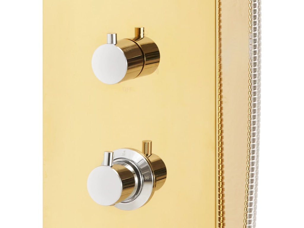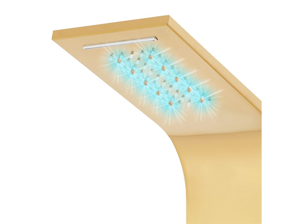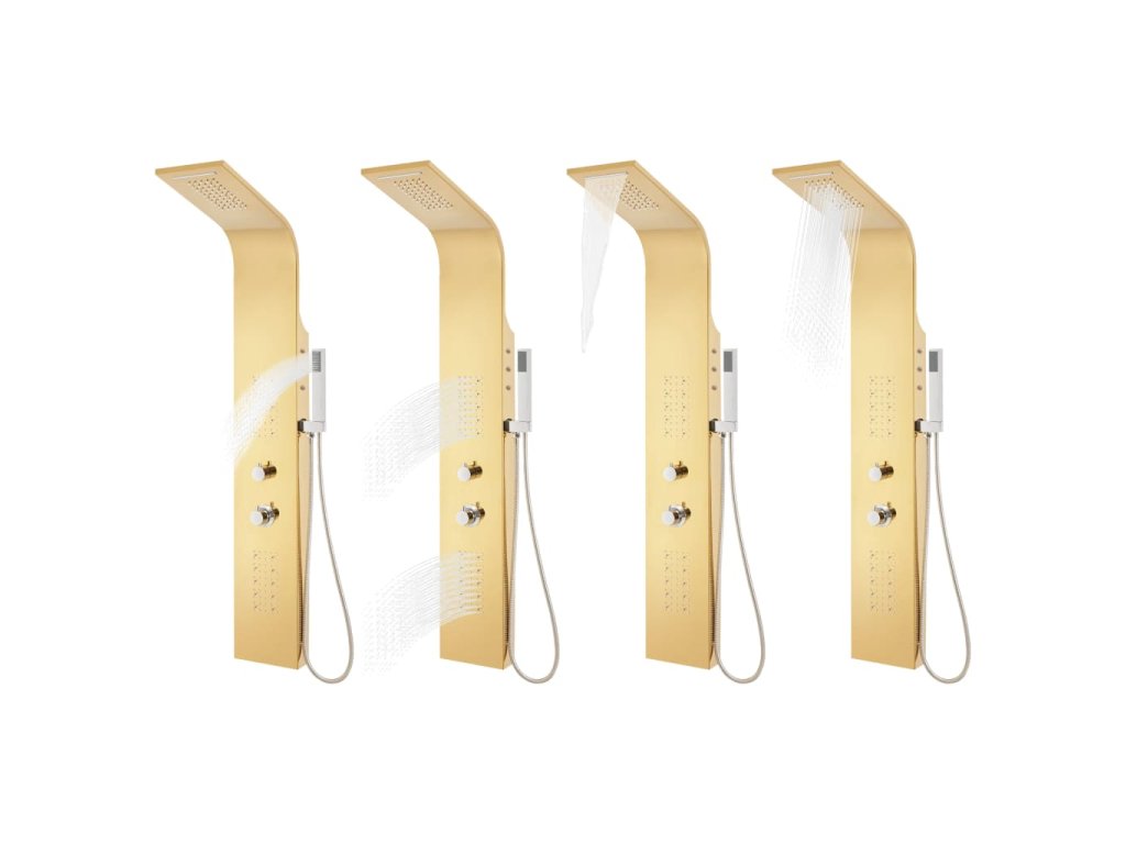 Sprchový panel je vyrobený z odolné nerezové oceli se zlatou zrcadlovou povrchovou úpravou a má krásný zaoblený design. Má čtyři funkce: tropický déšť, vodopád, hydromasážní trysky a ruční sprcha, které lze snadno ovládat prostřednictvím přepínacího regulátoru. LED světla si můžete zapnout či vypnout dle vaší momentální nálady. Teplota vody se reguluje pomocí knoflíku termostatu.