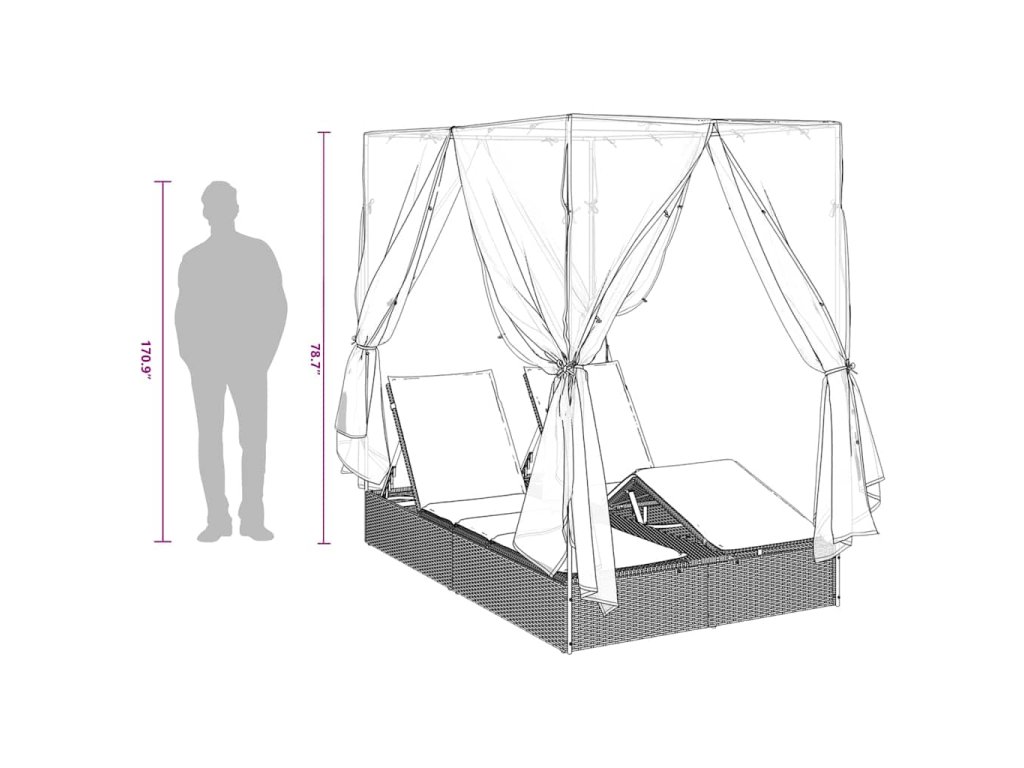 Mrkni na tohle skvělý venkovní dvojité lehátko se střechou a závěsy – je to ideální pro lenošení venku. Představ si, jak si užíváš sluneční paprsky na krásném ránu nebo se uvolňuješ v příjemném večeru, a to všechno v pohodlí a stínu díky tomuhle parádnímu lehátku. Má elegantní design a variabilní uspořádání, takže je super volba na zahrady nebo terasy, a poskytne ti skvělý zážitek venku.
