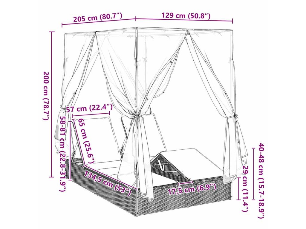 Toto venkovní dvojité lehátko kombinuje styl a užitečnost, ideální pro odpočinek na zahradě nebo terase. S elegantním designem je z polyratanu a má pevný ocelový rám, což znamená komfortní a praktické řešení pro venkovní volný čas. Hladké linie a moderní vzhled dělají z tohoto lehátka perfektní prvek do venkovního prostředí. Díky střeše a závěsům si vytvoříte vlastní venkovní útočiště. Prostorný design je ideální pro dva, skvělé pro páry nebo návštěvy. Ať už se sunčíte nebo užíváte chládek, tohle lehátko vyhovuje každému vkusu.