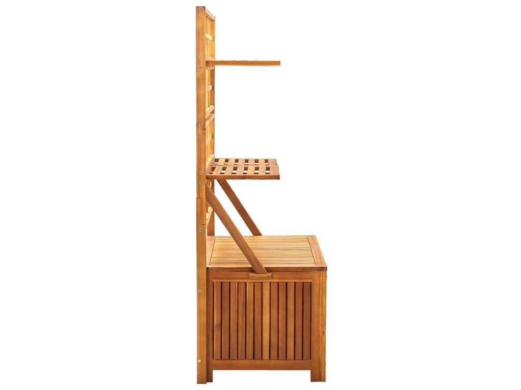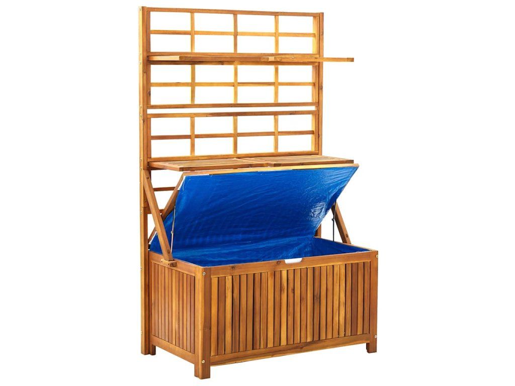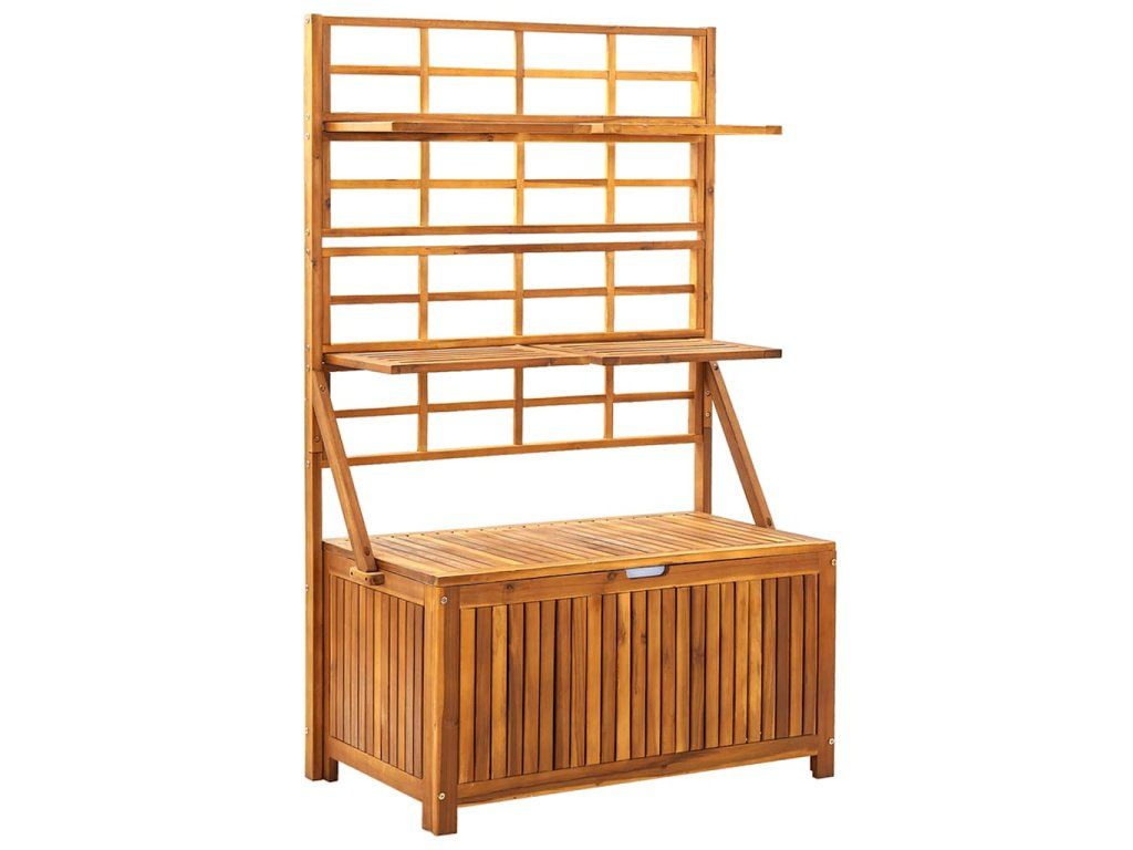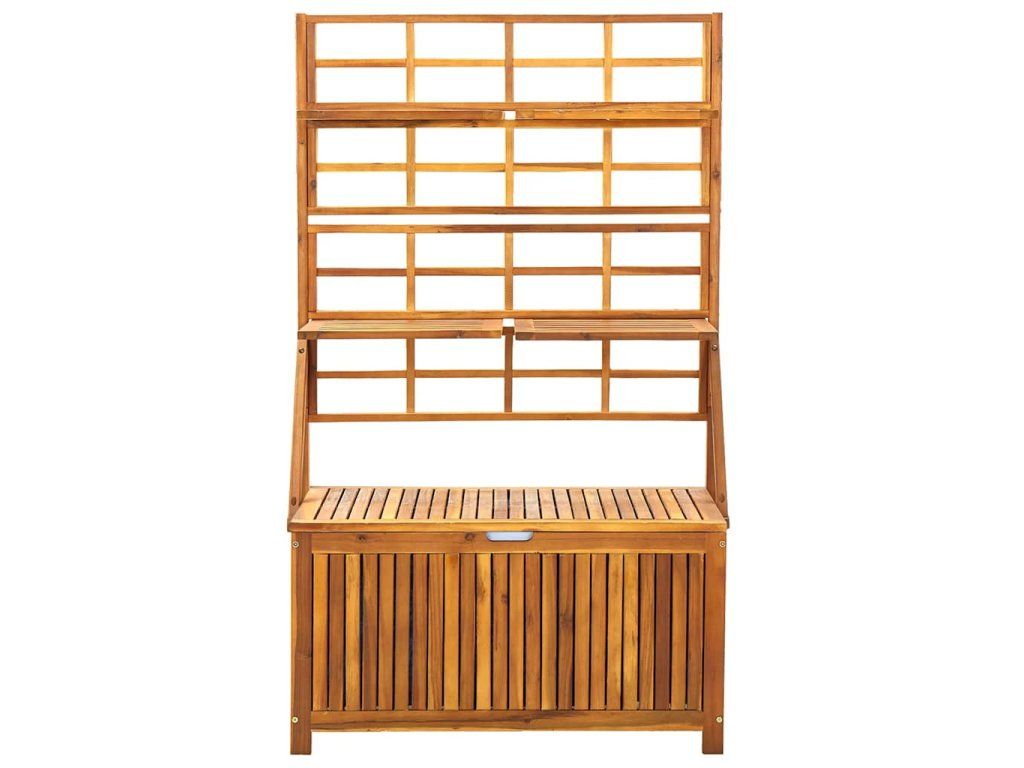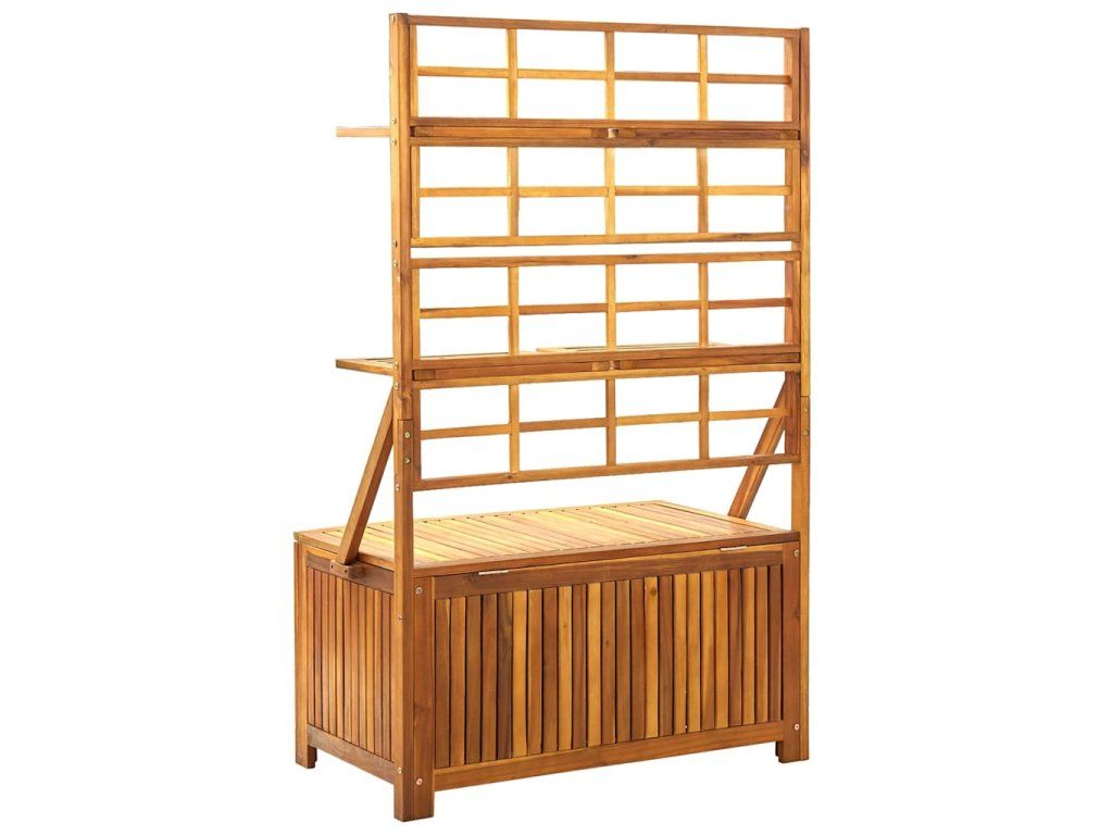 Tento box na podušky je vyrobený z masivního akáciového dřeva, tvrdého dřeva s hustou kresbou. Tento nádherně navržený box je stabilní, odolný a zaujme na první pohled. Zručné řemeslné zpracování a nádherná kresba dřeva navíc propůjčují každému kusu lehce odlišný charakter. Integrovaná treláž nabízí vynikající podporu pro popínavé rostliny. Na police můžete také postavit květináč. 4 přiložené police lze nastavit do různých pozic.