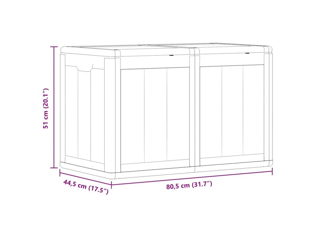 Úložná truhla je vyrobena ze 100% PP materiálu, takže je odolná vůči povětrnostním vlivům, UV záření, je lehká a snadno se přenáší. Zahradní úložný box se vyznačuje decentním, ale nadčasovým designem a dokonale zapadne do vašeho interiéru i exteriéru. Nabízí dostatek úložného prostoru pro podušky, polštáře a další domácí nebo zahradní potřeby, které chcete mít po ruce.