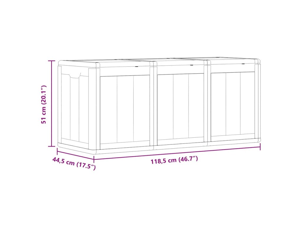 Úložná truhla je vyrobena ze 100% PP materiálu, takže je odolná vůči povětrnostním vlivům, UV záření, je lehká a snadno se přenáší. Zahradní úložný box se vyznačuje decentním, ale nadčasovým designem a dokonale zapadne do vašeho interiéru i exteriéru. Nabízí dostatek úložného prostoru pro podušky, polštáře a další domácí nebo zahradní potřeby, které chcete mít po ruce.