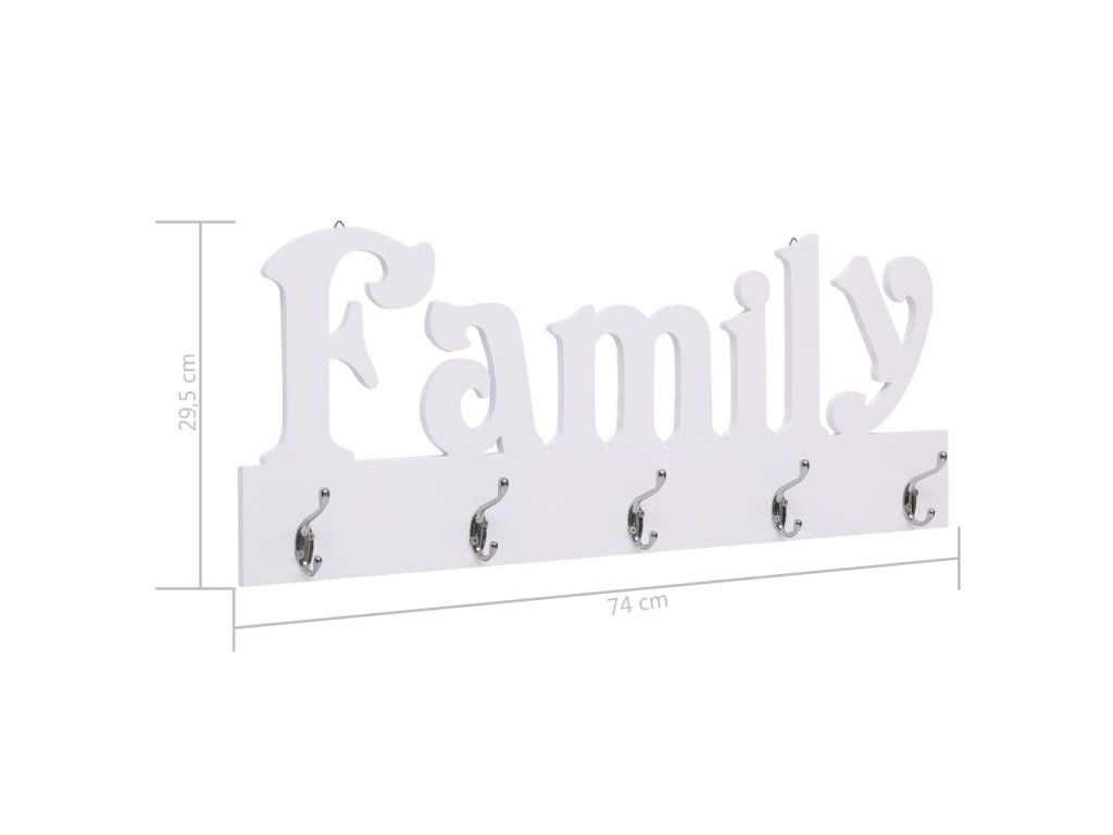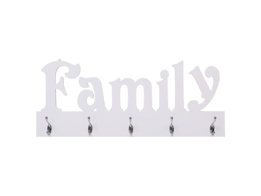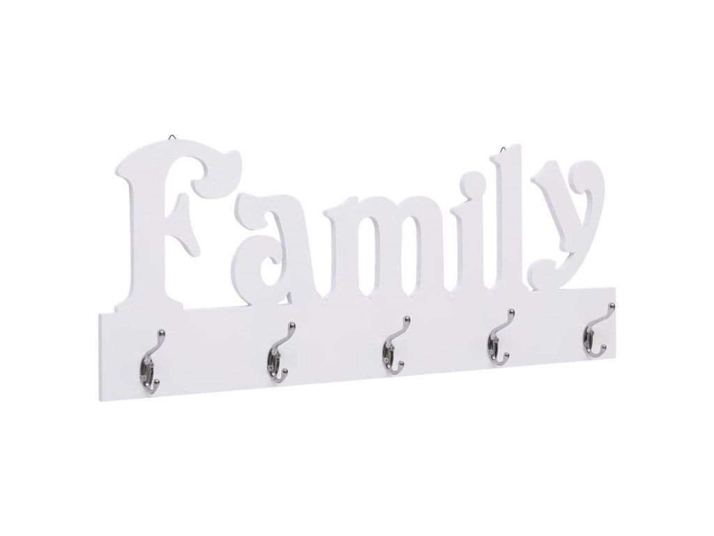 Věšák na oblečení vyniká svým jedinečným vyřezávaným nápisem „Family“ a má 5 měděných háčků, na které si můžete pověsit bundy, klíče, ručníky, deštníky a mnoho dalších věcí. Je vyrobený z kvalitní dřevotřísky, výborně odolává opotřebení, dlouho vám vydrží a nezůstávají na něm skvrny. Jednoduchý a praktický design věšáku nabízí výborný způsob, jak svému bydlení přidat na funkčnosti i potěšující atmosféře.