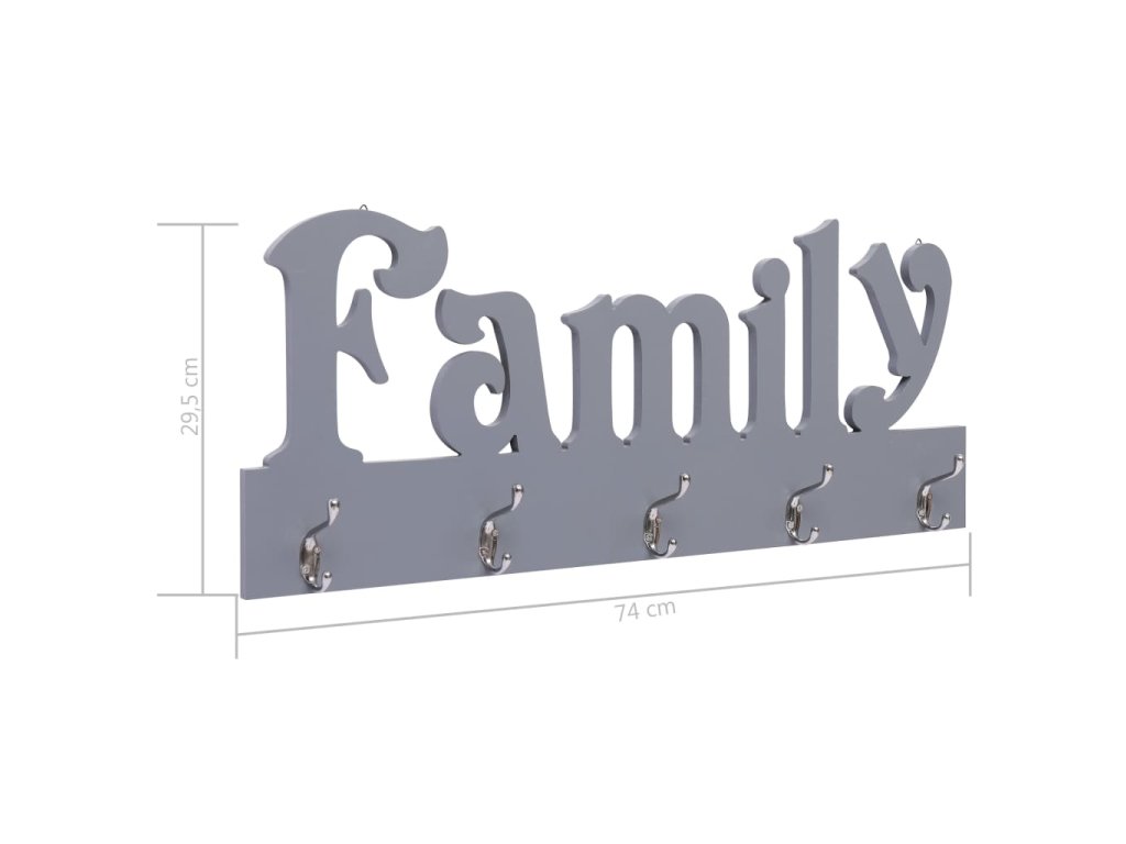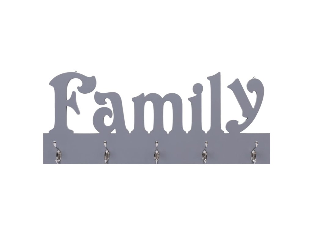 Věšák na oblečení vyniká svým jedinečným vyřezávaným nápisem „Family“ a má 5 měděných háčků, na které si můžete pověsit bundy, klíče, ručníky, deštníky a mnoho dalších věcí. Je vyrobený z kvalitní dřevotřísky, výborně odolává opotřebení, dlouho vám vydrží a nezůstávají na něm skvrny. Jednoduchý a praktický design věšáku nabízí výborný způsob, jak svému bydlení přidat na funkčnosti i potěšující atmosféře.