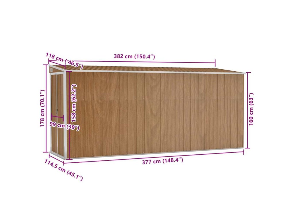 Nástěnný zahradní domek hnědý 118 x 382 x 178 cm pozinkovaná ocel 316232