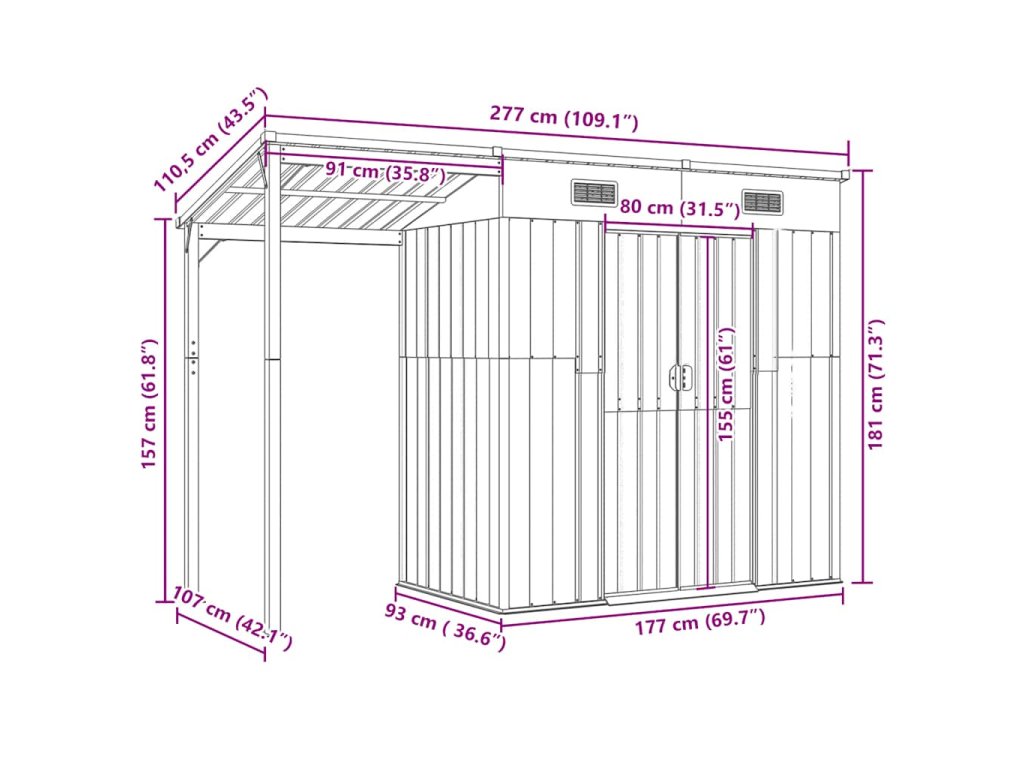 - Vnější rozměry přístřešku: 177 x 93 x 157/181 cm (Š x H x V)