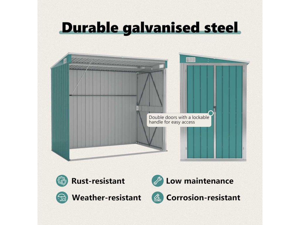 Díky tomu, že je vyroben z pozinkované oceli a kovu, vyžaduje sklad minimální údržbu a je velmi odolný. Dvojité otevírací dveře v přední části umožňují snadný vstup a výstup. Plastová rukojeť s funkcí zámku zajišťuje bezpečnost vašich věcí. Navíc dešťová voda automaticky odtéká ze střechy díky šikmé konstrukci.