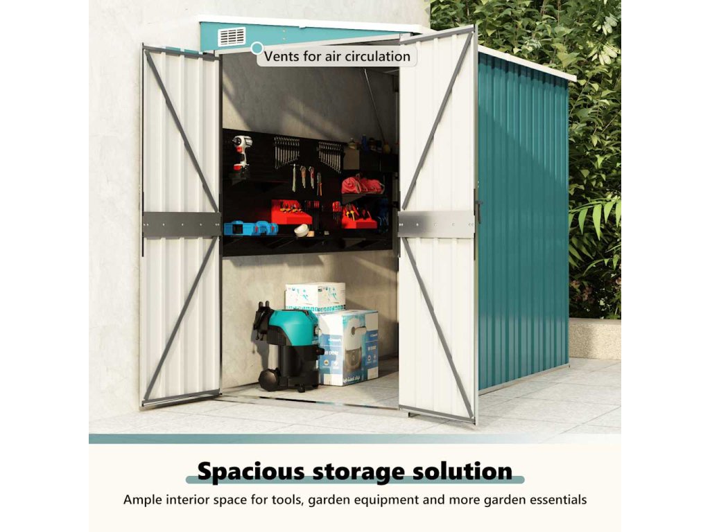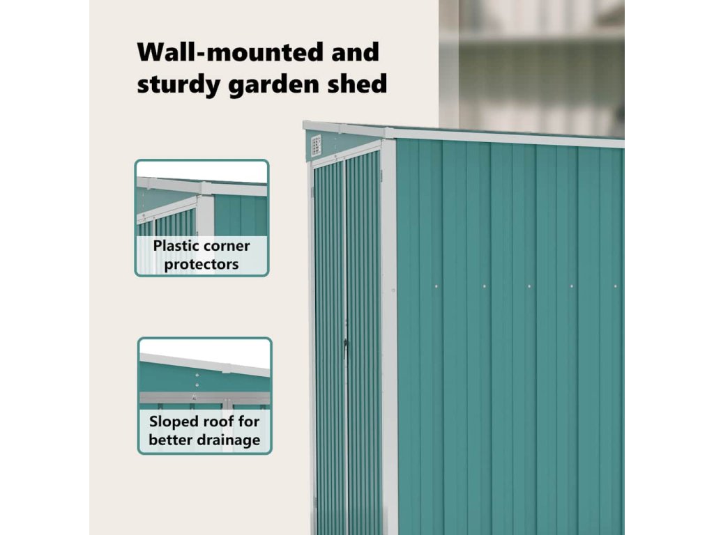 Tento nástěnný zahradní domek je ideální pro uložení různých předmětů, jako je nářadí, zahradní nábytek, zahradní vybavení atd. Domek nabízí ochranu před nečistotami, prachem a také před silným větrem a povětrnostními vlivy.