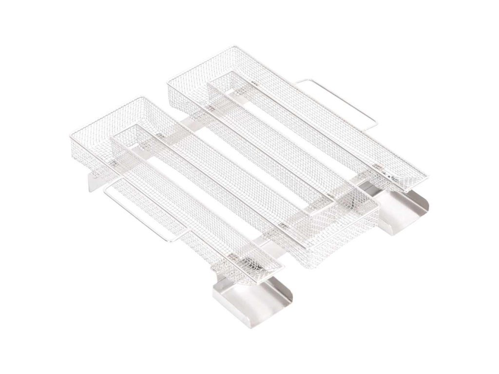 - Generátor studeného kouře: Stačí naplnit pilinami a zapálit čajovou svíčkou, dokud piliny nezačnou měnit barvu. Vyjměte čajovou svíčku a umístěte generátor kouře do udírny. Kompaktní mřížka ve tvaru písmene M umožňuje rovnoměrné a pomalé hoření štěpků po dobu až 10 hodin.